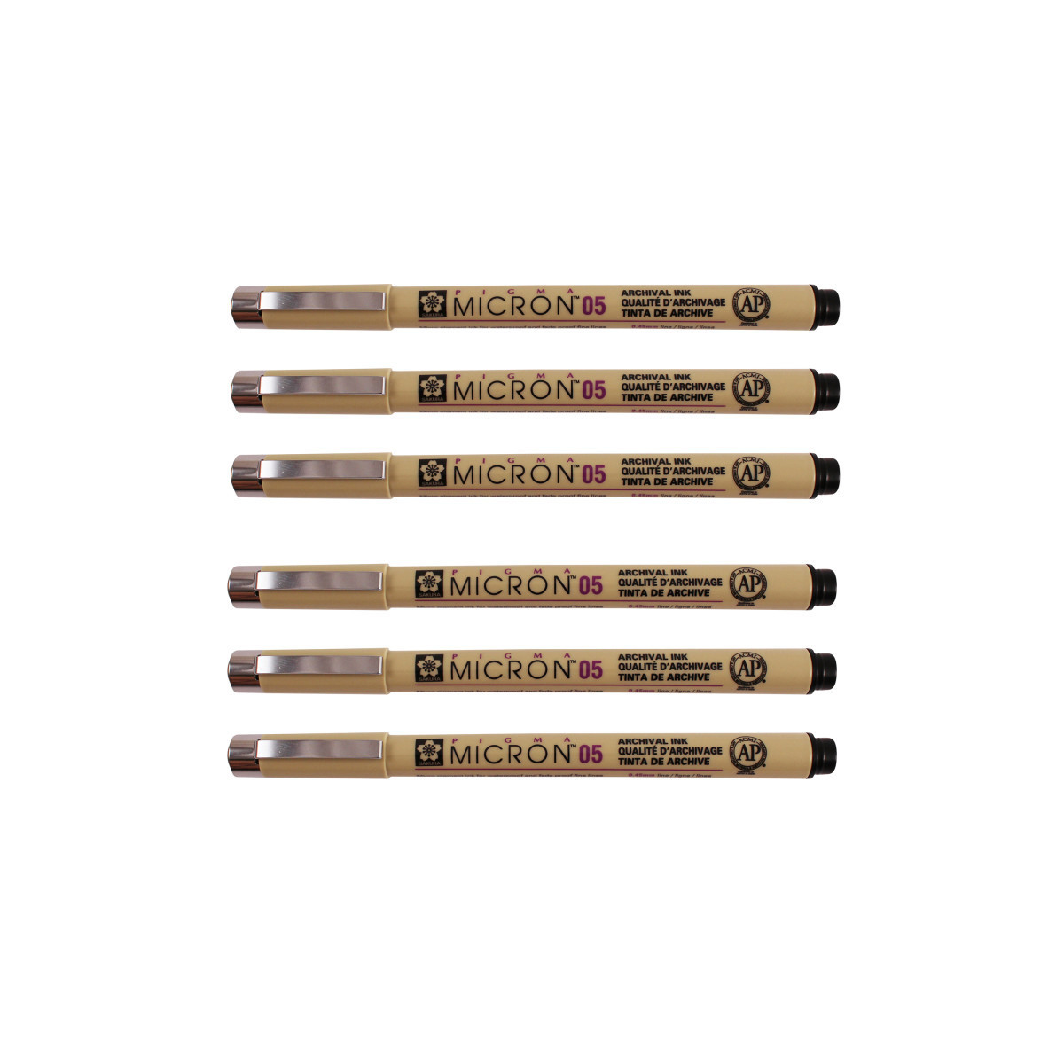 Pigma Micron pens are waterproof and permanent fineliners that are loyally used by designers, scientists, archivists, architects, Manga artists, cartoonists, illustrators and hobbyists. The fine nib makes this pen ideal for creating both technical and artistic drawings. The fineliners have a protective metal sleeve around the extended tip to give extra control and increased resilience when used with drawing aids such as rulers. This permanent, fade resistant, chemically stable, pigment-based ink will not bleed or run if liquids are spilled on or applied to the document after the ink has dried. Perfect for legal situations, Pigma ink is nearly impossible to alter on documents, in log books, or on checks. Architects, archivists, anthropologists, entomologists and laboratories depend on Pigma Micron for record keeping. Pigma Micron is the first disposable technical pen using archival pigmented ink. It does not smear, feather, or bleed through on most paper. Sold as a pack of 6.