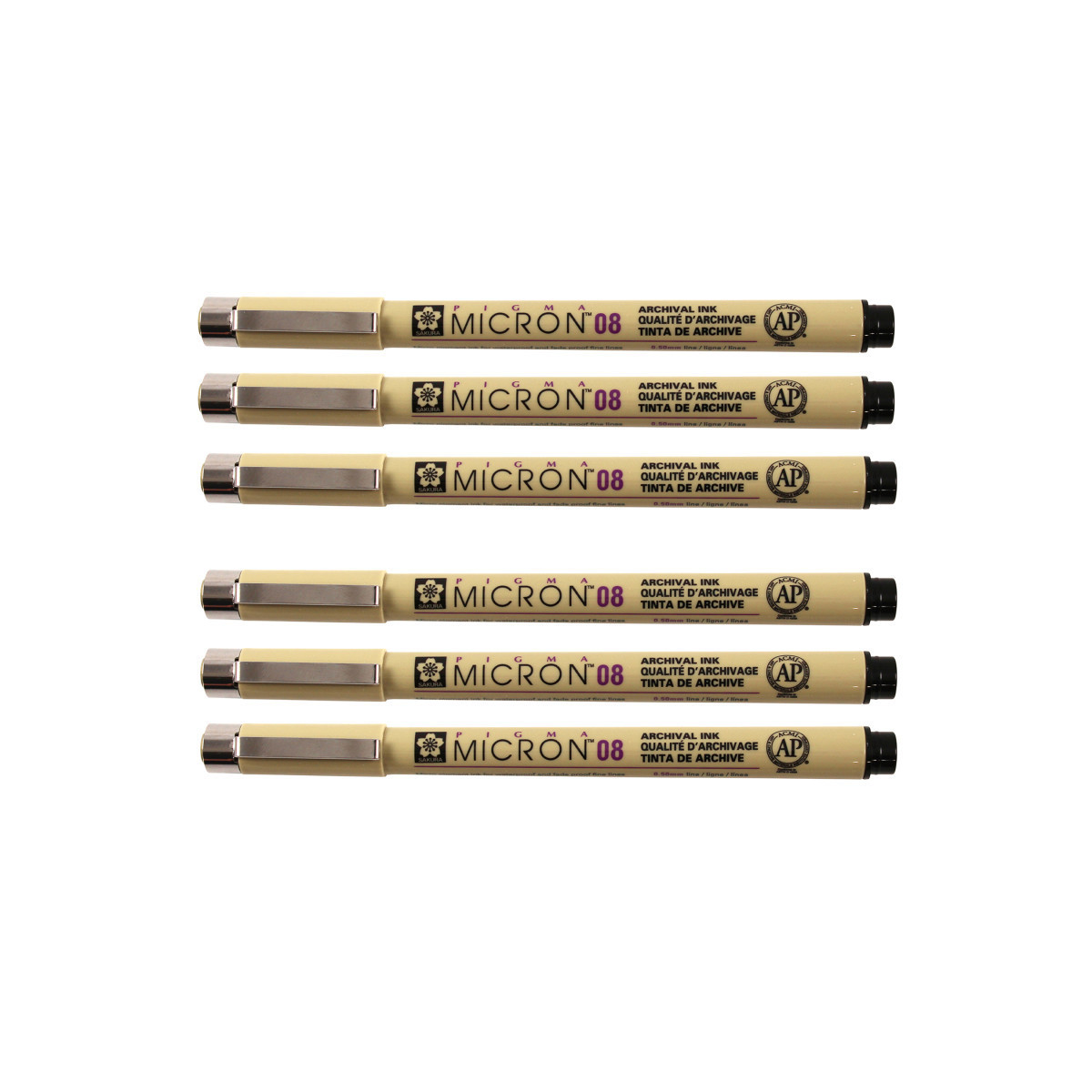 Pigma Micron pens are waterproof and permanent fineliners that are loyally used by designers, scientists, archivists, architects, Manga artists, cartoonists, illustrators and hobbyists. The fine nib makes this pen ideal for creating both technical and artistic drawings. The fineliners have a protective metal sleeve around the extended tip to give extra control and increased resilience when used with drawing aids such as rulers. This permanent, fade resistant, chemically stable, pigment-based ink will not bleed or run if liquids are spilled on or applied to the document after the ink has dried. Perfect for legal situations, Pigma ink is nearly impossible to alter on documents, in log books, or on checks. Architects, archivists, anthropologists, entomologists and laboratories depend on Pigma Micron for record keeping. Pigma Micron is the first disposable technical pen using archival pigmented ink. It does not smear, feather, or bleed through on most paper. Sold as a pack of 6.
