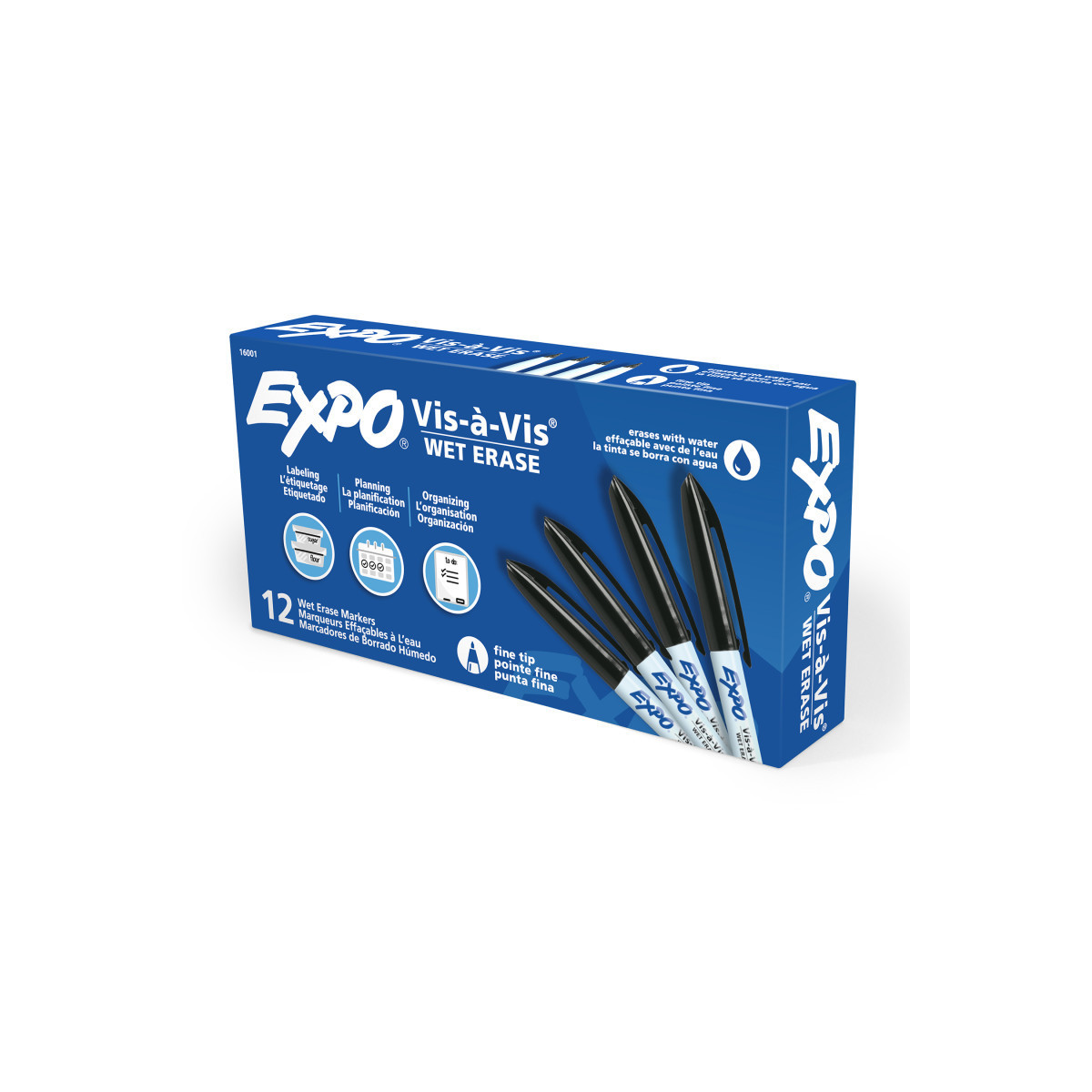 When you need important information to stand out and stay put, depend on EXPO Vis-à-Vis Wet Erase Markers! Their vibrant, bold colors mark and stay in place on whiteboards, hard plastic, laminated sheets, and other non-porous surfaces until you easily wipe them away with a damp cloth. Use them to keep track of dates on calendars, label dry food storage containers, or easily identify what's in your plastic bins. EXPO Vis-à-Vis markers come in a variety of colors and feature a fine tip. Each box includes 12 markers.