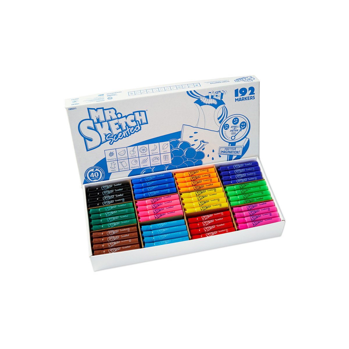 Colors are bright and vivid. Mr. Sketch markers have twice the ink of most markers to last super-long. The smooth-flowing chisel-tip makes sketching easier. The tip is sturdy to keep its shape even after months of coloring. The specially formulated, non-bleeding water-based ink is great for easels. It's safe for children and certified AP non-toxic. Each color has its own fun scent to feed your imagination. See product description for all color scent combinations. Includes 192 markers the following scents: Raspberry, Melon, Cherry, Orange, Banana, Mint, Green Apple, Tropical Punch, Blueberry, Grape, Cinnamon, and Licorice.