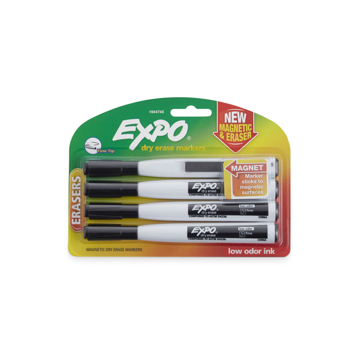 Lock your whiteboard markers to any metal surface with Expo® Magnetic Dry Erase Markers with Eraser. An integrated magnet provides convenient and care-free storage on metal-backed white boards and other metal surfaces. What's more, the cap features a handy Expo eraser for precise, on-the-fly erasing. Each Expo dry erase marker has a fine tip that draws bold details and quick-drying, low-odor ink that's perfect for both the office and classroom. Pack of 4 markers.