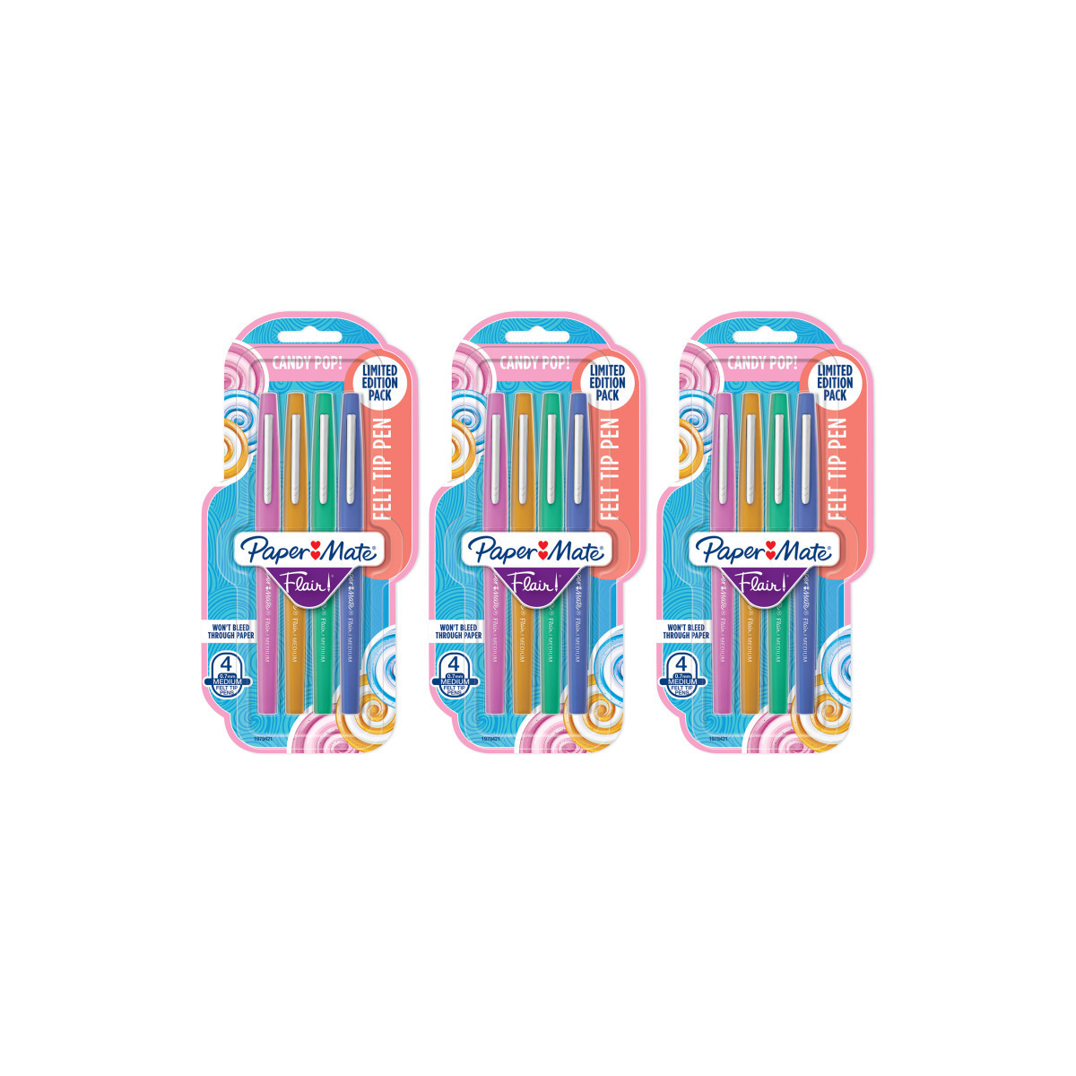 Turn everyday writing into eye candy with the Paper Mate Flair Pens, limited edition Candy Pop pack! Scrumptious candy-inspired shades plus smear-resistant ink that won't bleed through the page combine to give all your drawings, doodles and projects a pop of indulgent color. Flair pens have a medium point (0.7mm) that writes in bold, colorful lines along and a Point Guard that prevents the tip from fraying. Treat yourself to bold, fun, excitingly sweet sketching and writing with Paper Mate felt tip colored pens. Each pack includes 4 pens. Sold as 3 packs for a total of 12 pens.
