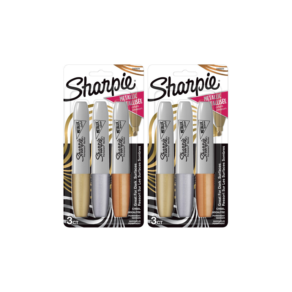 Get your shine on with Sharpie Metallic Permanent Markers. With a versatile chisel tip, create fine lines and thick marks with major style. Stand out in a crowd by using these metallic permanent markers for hand-lettering, coloring, labeling, and crafting. Each permanent marker is made with specially formulated ink designed to be quick-drying and fade- and water-resistant. Every mark boldly stands out on light and dark surfaces, meaning they're perfect for projects on a black background. Each pack includes 3 markers. Sold as 2 packs for a total of 6 markers.