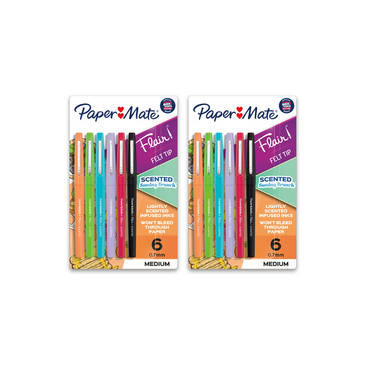 Delight your senses with the smell of sweet Sugared Grapefruit and rich Hazelnut Latte with Paper Mate Flair Scented Sunday Brunch-Themed Pens. The same vivid Flair colors you know and love with a lightly added scent! With 6 scents and colors inspired by Sunday Brunch, these Flair pens will transport you to your favorite meal as you write, color, and doodle. Flair pens won't bleed through paper and feature Point Guard technology and smear-resistant ink so your work stays neat. Order up the fun of Sunday Brunch for your bullet journaling, adult coloring, note taking, and more, with Paper Mate Flair! Each pack includes 6 pens. Sold as 2 packs for a total of 12 pens.