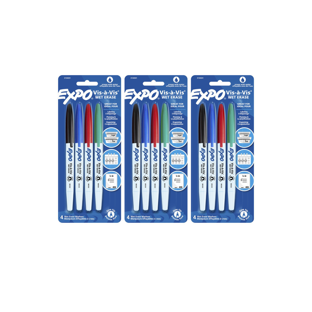 Label, plan, and organize with ease with EXPO Vis-a-Vis Wet Erase Markers. Depend on EXPO wet erase markers for writing or drawing on whiteboards, hard plastic, laminated sheets, and other nonporous surfaces. These EXPO markers feature ink that easily wipes off with a damp cloth. The fine-tip markers leave fine detailed lines even in small spaces. Each pack includes 4 markers. Sold as 3 packs for a total of 12 markers.