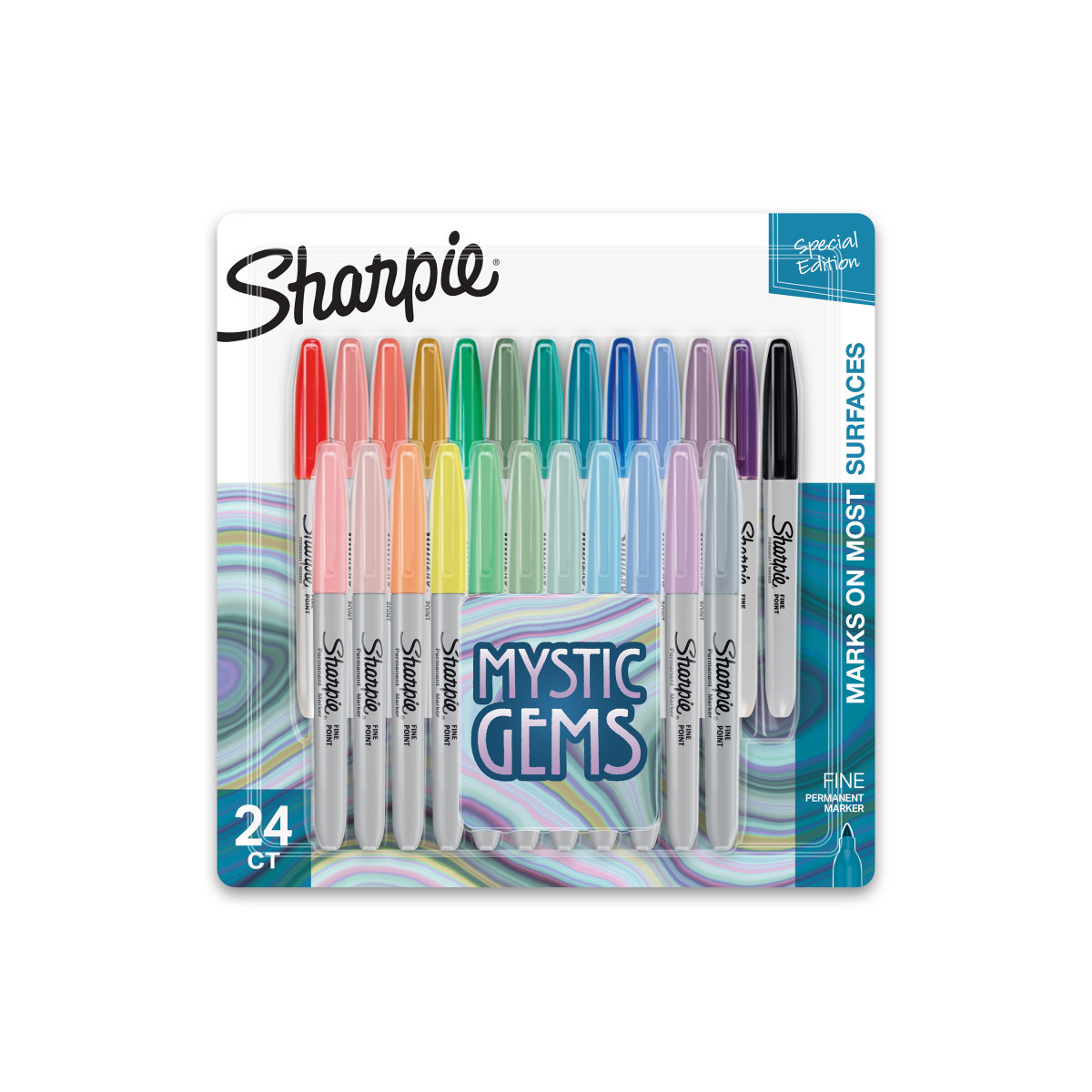 Made to mark practically anywhere, Sharpie Permanent Markers inspire you to transform ordinary surfaces into passionately creative statements. This special-edition pack features Sharpie Markers in classic and Mystic Gem colors, which combine soft pastels with darker, natural colors to produce vibrant marks inspired by the dynamic energy of gemstones. The original permanent marker, Sharpie features iconic ink that dries quickly and resists both water and fading. Finally, depend on these fine-point markers to leave bold marks that impress. Pack of 24.