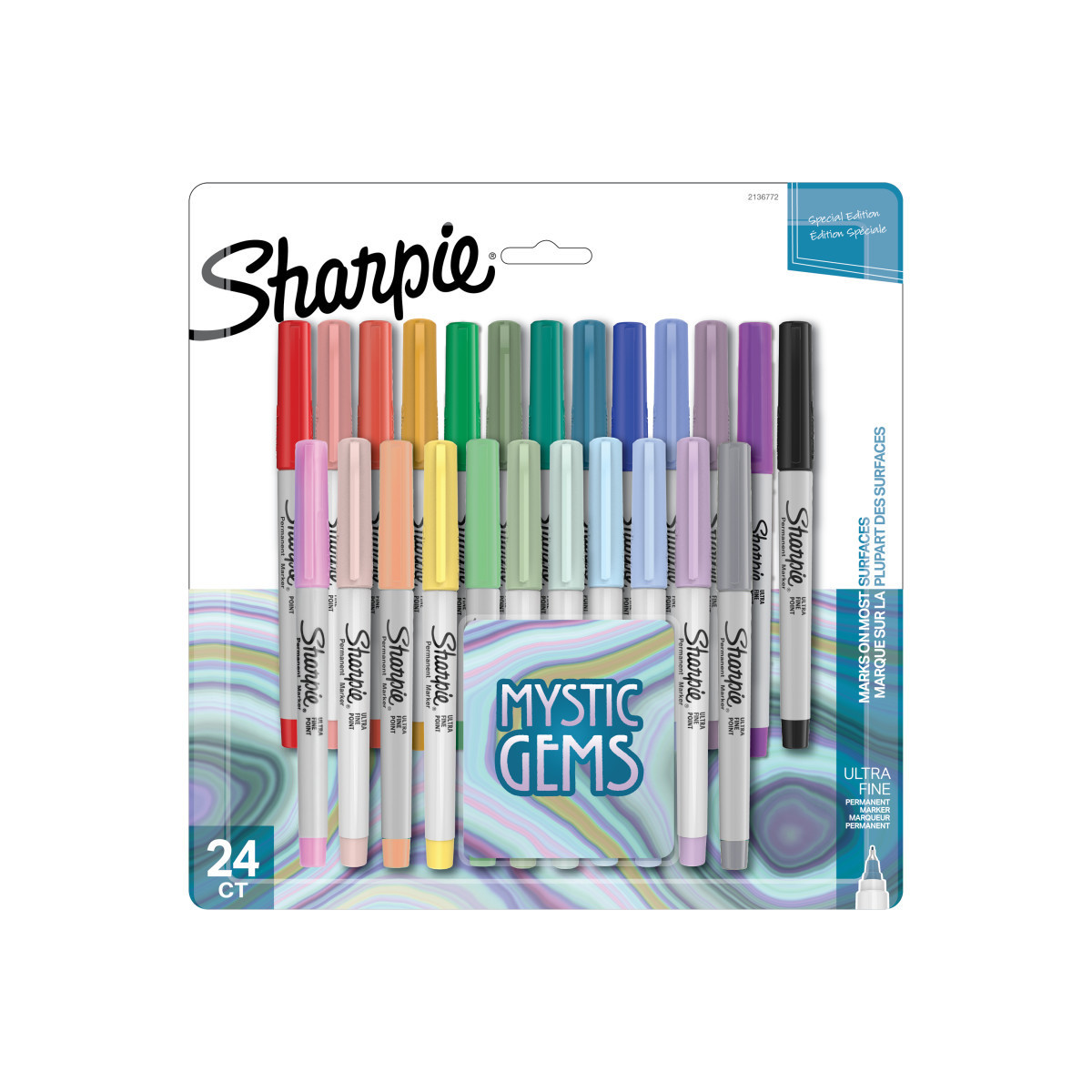 Made to mark practically anywhere, Sharpie Permanent Markers inspire you to transform ordinary surfaces into passionately creative statements. This special-edition pack features Sharpie Markers in classic and Mystic Gem colors, which combine soft pastels with darker, natural colors to produce vibrant marks inspired by the dynamic energy of gemstones. The original permanent marker, Sharpie features iconic ink that dries quickly and resists both water and fading. Finally, depend on these ultra-fine point markers for precision and extreme control when writing and detailing. Pack of 24.