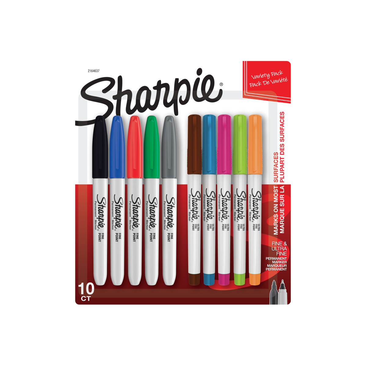 Bold to the max and permanent to the core, Sharpie Permanent Markers inspire you to transform ordinary surfaces into passionately creative statements. Made to write practically everywhere, vivid Sharpie markers eliminate the dull and boring. The original permanent marker, Sharpie has iconic ink that dries quickly and resists both water and fading. While pale imitations wither away, Sharpie markers make creations that endure. This pack contains fine point markers built for jaw-dropping marks and ultra-fine point markers for extreme control. Whether in school or at home, Sharpie Permanent Markers inspire you to tell your whole story. Each pack includes 10 Sharpie markers: 5 Fine Point Markers in Black, Blue, Red, Green and Dark Matter Gray and 5 Ultra Fine Point Markers in Brown, Peacock Blue, Berry, Lime and Tangerine