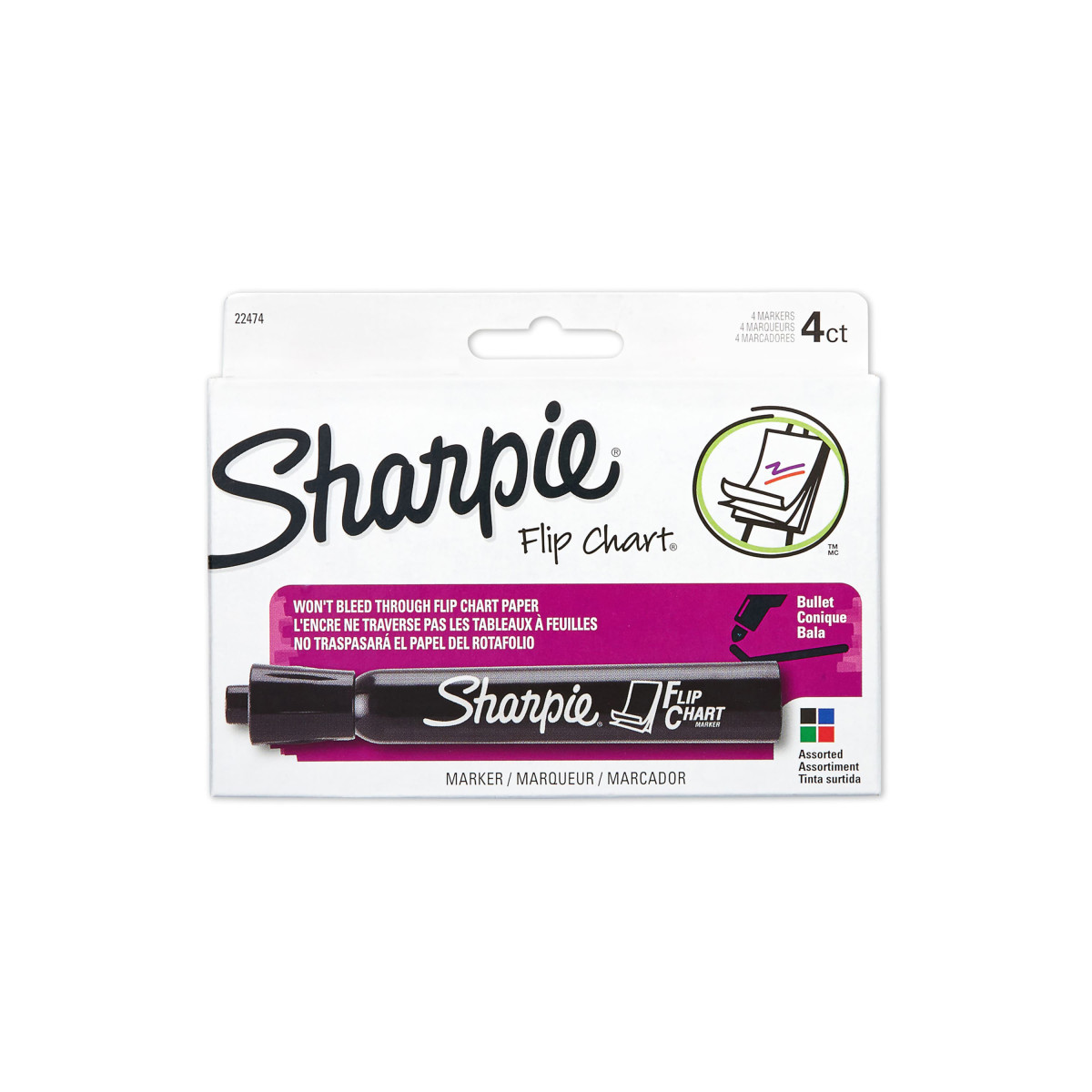 Sharpie Flip Chart Markers are ideal for highlighting the important points and creating impressive presentations. The colorful, water-based ink is designed to not bleed through flip chart paper. The markers are also low odor making them ideal for the office and classroom. Plus, the Sharpie markers have a detailed bullet tip designed to minimize squeaking. Includes 4 bullet tip markers in black, blue, green, and red.
