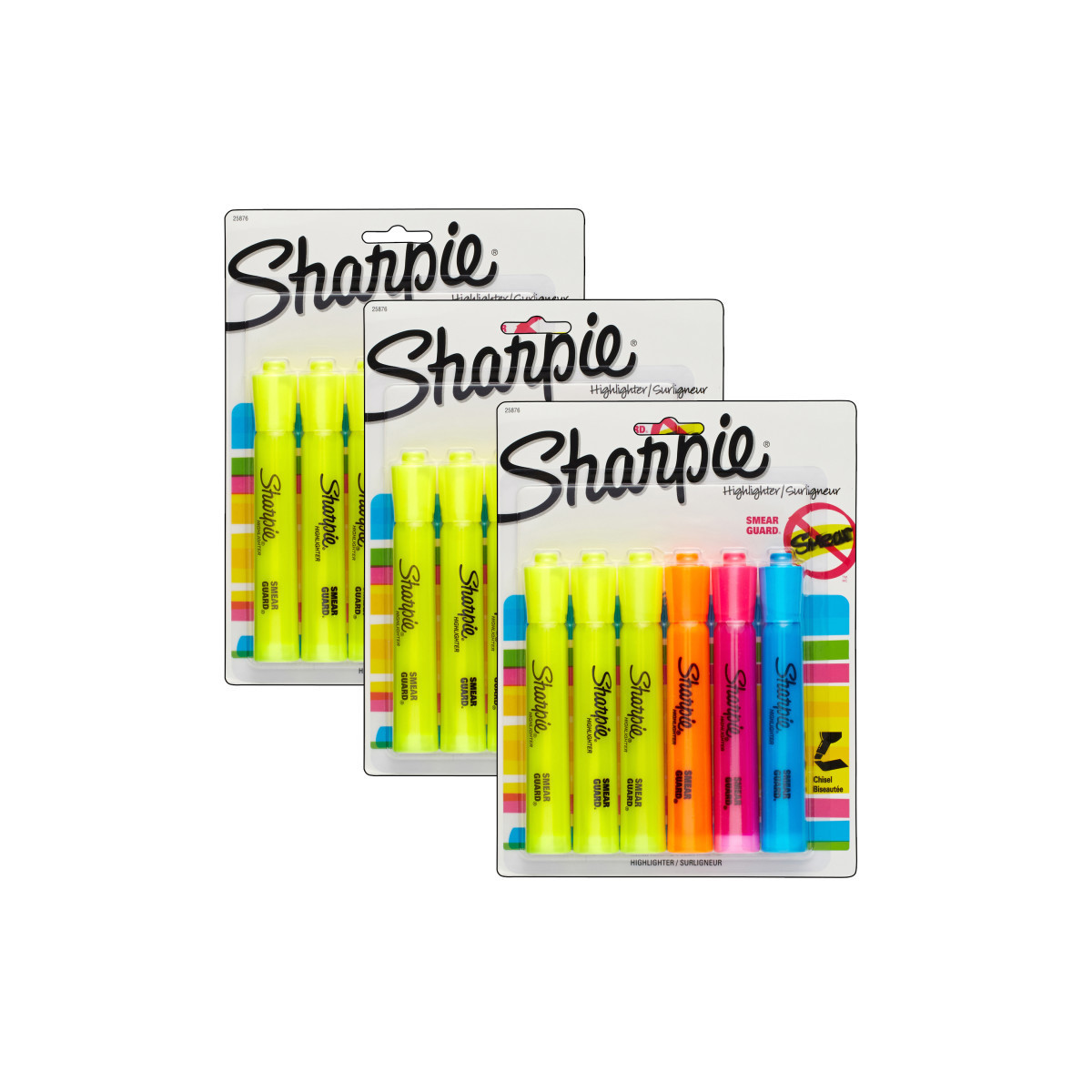 Enjoy reliable, long-lasting marking with Sharpie® Tank Highlighters. Featuring a wide barrel, a large ink supply, and a chisel tip, these highlighters deliver dependable and accurate marks. They also have SmearGuard® ink that resists smearing (let ink dry before highlighting). Bright and colorful ink stands out on the page. Versatile chisel tip easily produces wide and narrow lines. Each pack includes 6 highlighters in assorted colors. Sold as 3 packs for a total of 18 highlighters.
