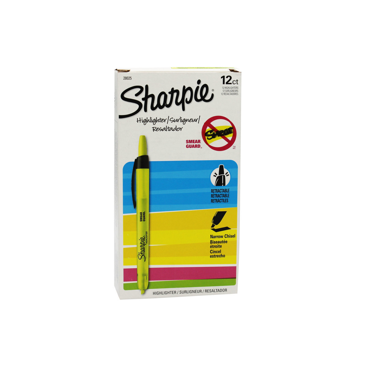 With a capless, click-and-go design, the Sharpie Retractable Highlighter offers on-the-go convenience for highlighting, organizing and marking up important documents. The push button makes this one-handed highlighter simple and effective, and quick-drying ink won’t bleed through most paper, so you can even highlight on handwritten notes and inkjet printouts. A handy Safety Valve prevents the Sharpie Retractable from drying out, and a convenient pocket clip lets you carry it wherever you go. Each box includes 12 highlighters.