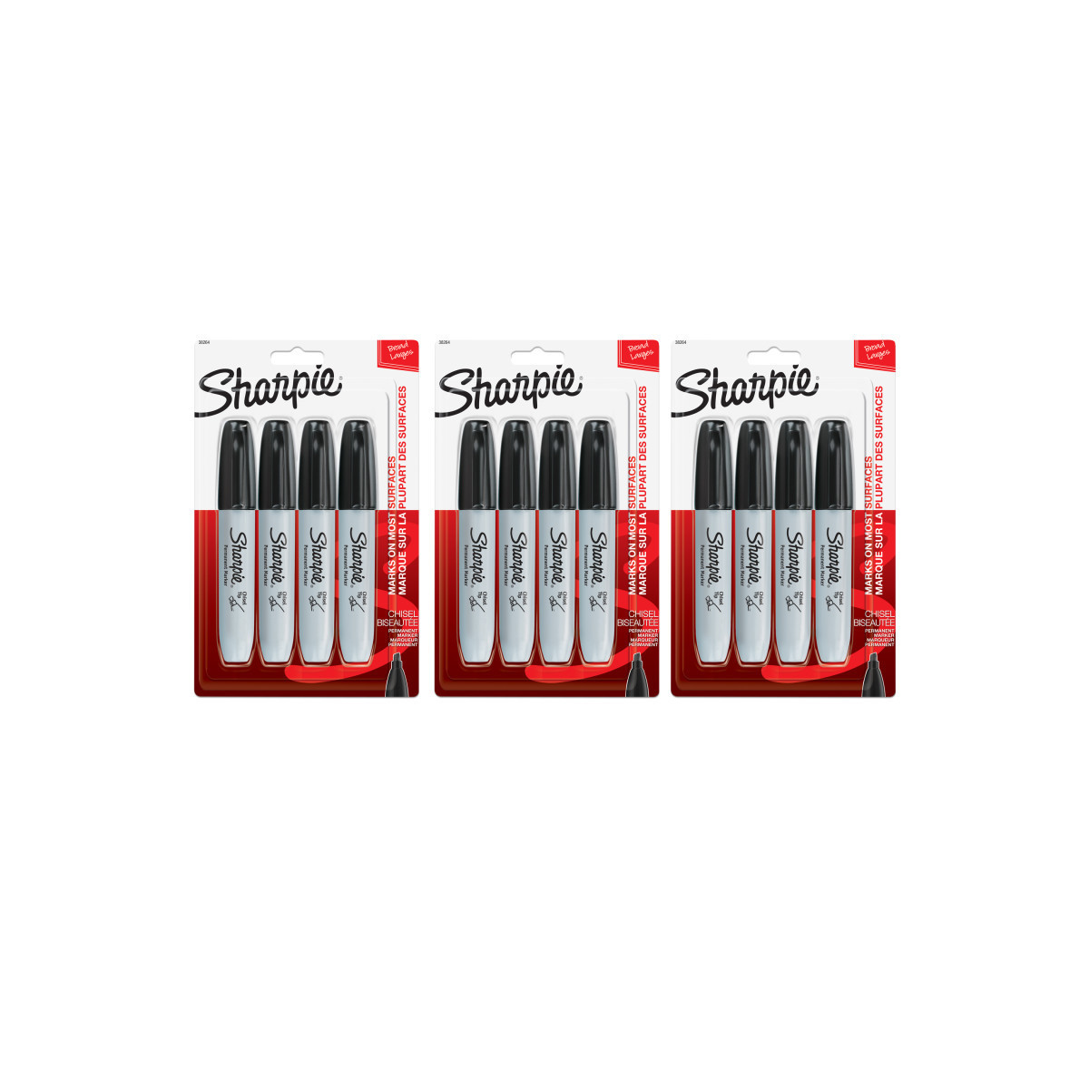 The permanent marker that writes three ways, Sharpie® Chisel Tip Permanent Markers have a versatile tip that makes broad, medium, and fine strokes - so you can express yourself any way you want. Proudly permanent ink marks on paper, plastic, metal, and most other surfaces. Intensely brilliant colors create eye-popping, vibrant impressions. Remarkably resilient ink dries quickly and resists both fading and water; AP certified. Endlessly versatile chisel tip is perfect for countless uses in the classroom, office, home, and beyond. Each pack includes 4 markers. Sold as 3 packs for a total of 12 markers.