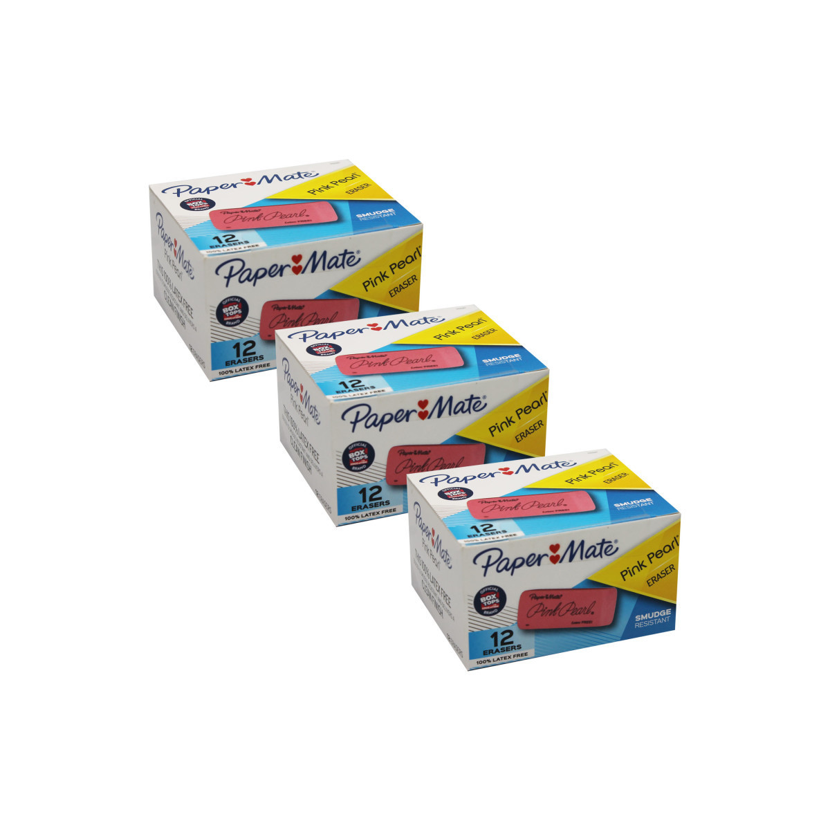 Stop struggling with eraser smudges and enjoy the clean finish of Paper Mate Pink Pearl Erasers. Thanks to a smear-resistant, latex-free design, the erasers remove mistakes so thoroughly, only you will ever know they existed. Their fresh finish makes them the perfect partner for essays, exams and the rest of your writing. Add on a classic, easy-to-maneuver design and it's no wonder that Paper Mate erasers are a dependable choice. Each pack includes 12 erasers. Sold as 3 packs for a total of 36 erasers.