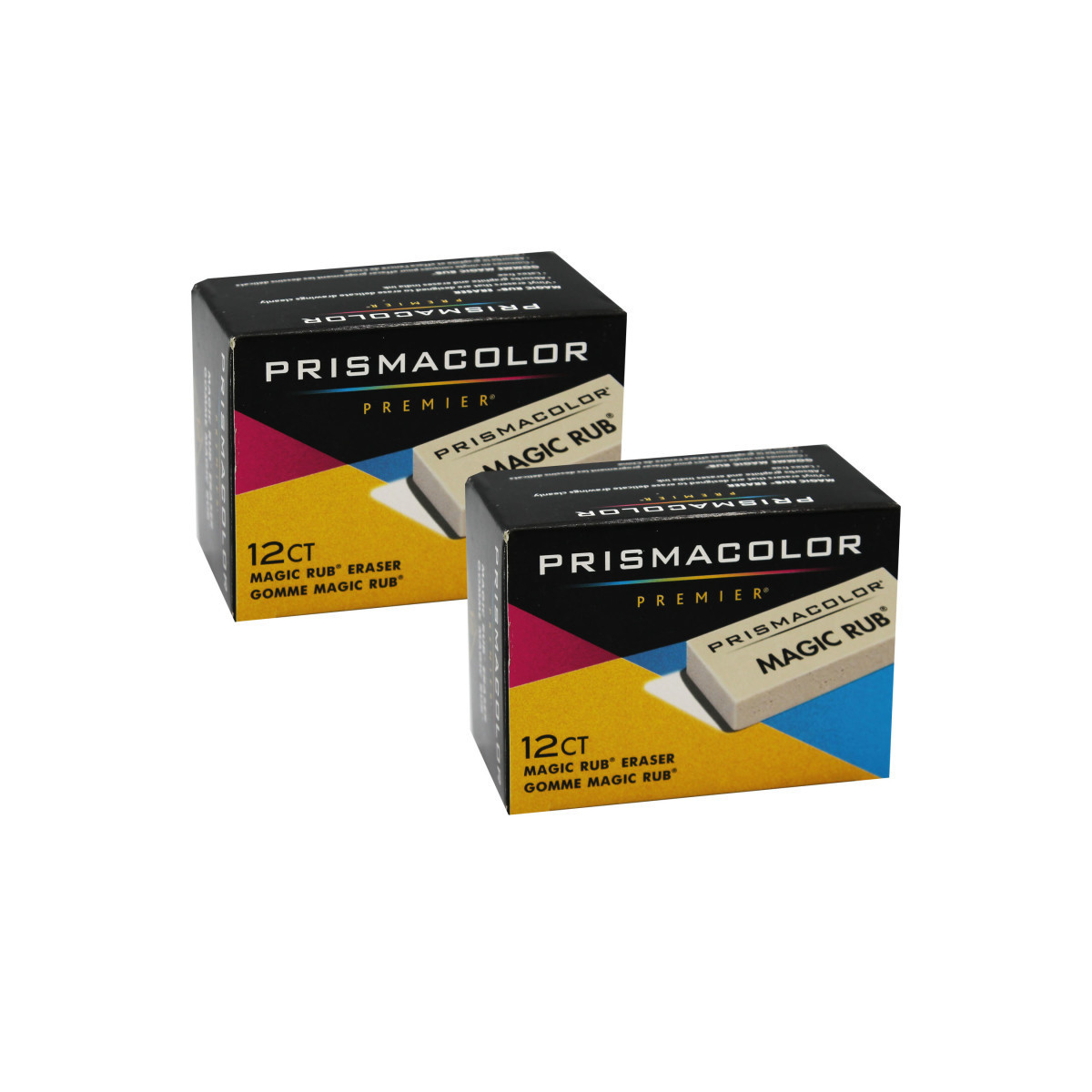 Clean up your act and move right along with this professional quality vinyl eraser. The Prismacolor Magic Rub® Eraser easily absorbs graphite and erases India ink. This easy to hold eraser allows for maximum control, making it easy to erase small details of intricate drawings. Perfect for use on polyester-base drafting films, delicate drawings or tracing paper surfaces. Latex-free, vinyl erasers that are designed to erase delicate drawings cleanly. Each pack includes 12 erasers. Sold as 2 packs for a total of 24 erasers.