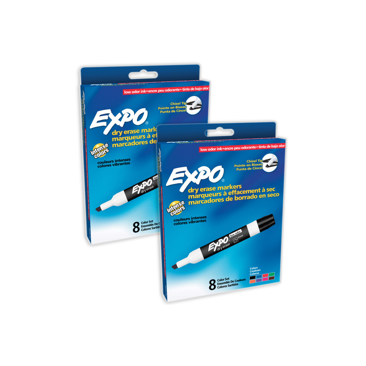 Keep your classroom engaged, create compelling presentations and stay organized at home with Expo Low Odor Dry Erase Markers. These whiteboard markers are available in a bold range of colors that produce consistent marks with less skipping. Use Expo dry erase markers to track, schedule and present your point in a brilliant fashion. Intense, bold colors take center stage even from a distance. You can get Expo wet or dry erase markers in a wide range of tip sizes, ensuring your point gets across. Each pack includes 8 chisel-tip markers in 8 colors. Sold as 2 packs for a total of 16 markers.