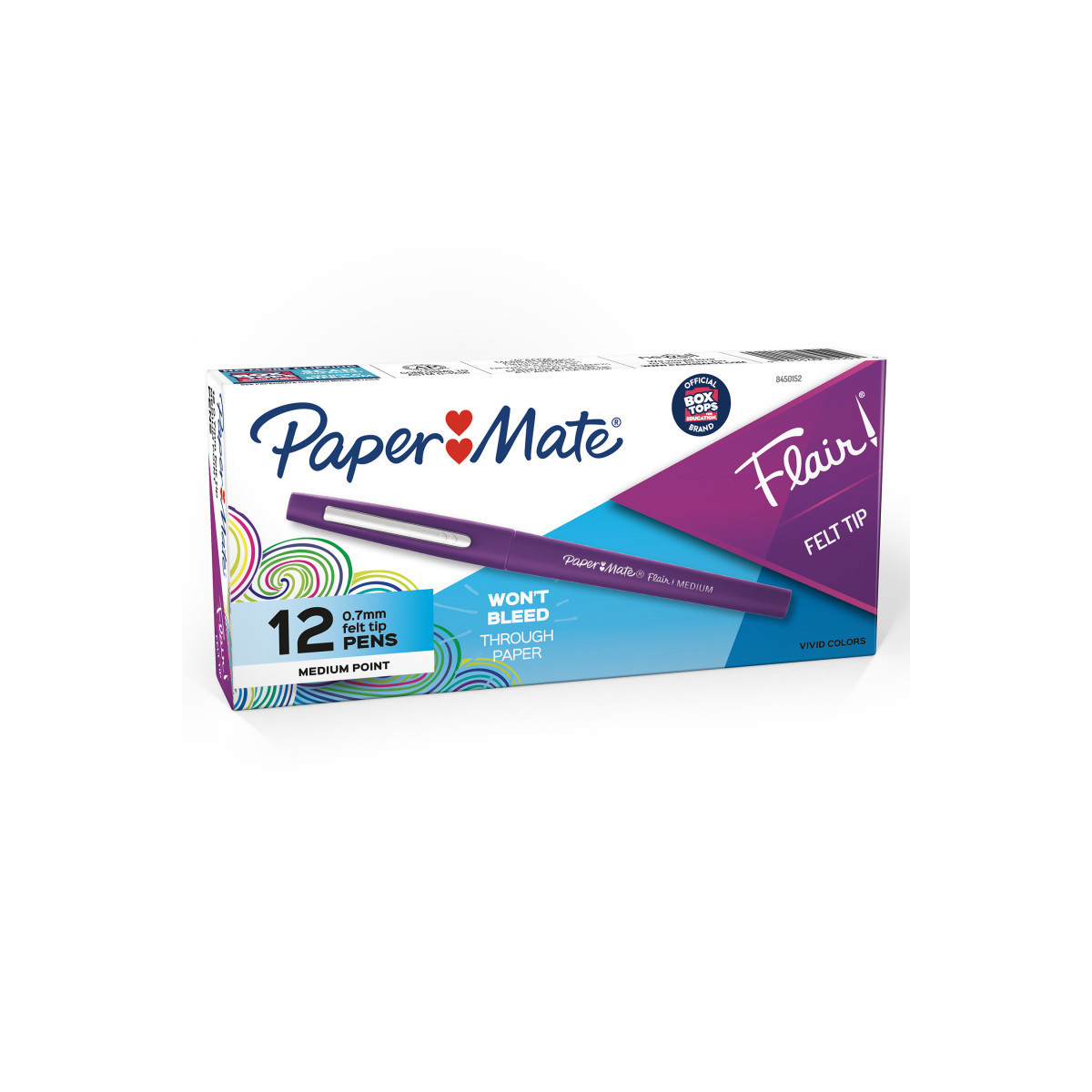 Boost your writing fun-factor with Paper Mate Flair Felt Tip Pens! With a rainbow of vivid colors to choose from and smear-resistant ink that won't bleed through the page, these colored pens make writing a blast. The medium point (0.7mm) writes in bold, colorful lines so your self-expression makes a major statement. The best part of all? Everything you can create—whether you're taking notes, drawing, doodling, or doing anything else that inspires you. With Flair Pens, there's no limit to your fun. Each box includes 12 Flair pens.