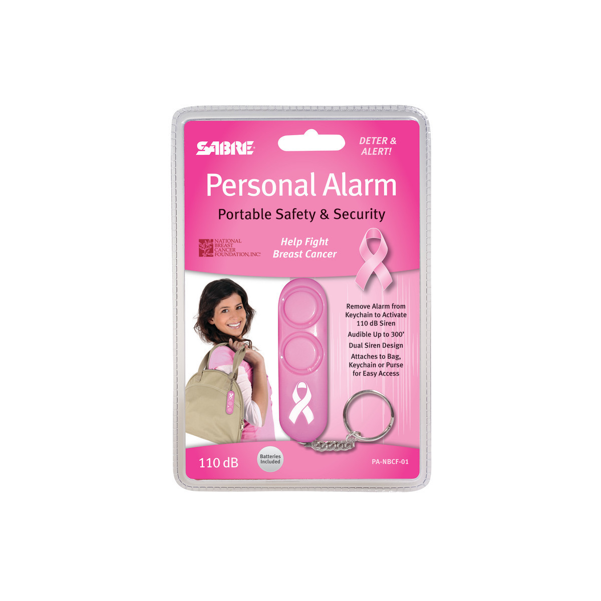 This pink, sleek, compact modern design keychain attaches to backpack, purse or keys for convenient, instant access, plus greater value with batteries included (requires 4xLR41). The 110 dB dual siren alarm helps call for assistance in an emergency and helps deter attacker (audible up to 600 feet/185M away). Simple to use and reusable; pull metal chain from device to sound 110 dB alarm; push pin back in to stop sound and use again. Safe for children, and a self-defense option for any age. Supports NBCF (National Breast Cancer Foundation).
