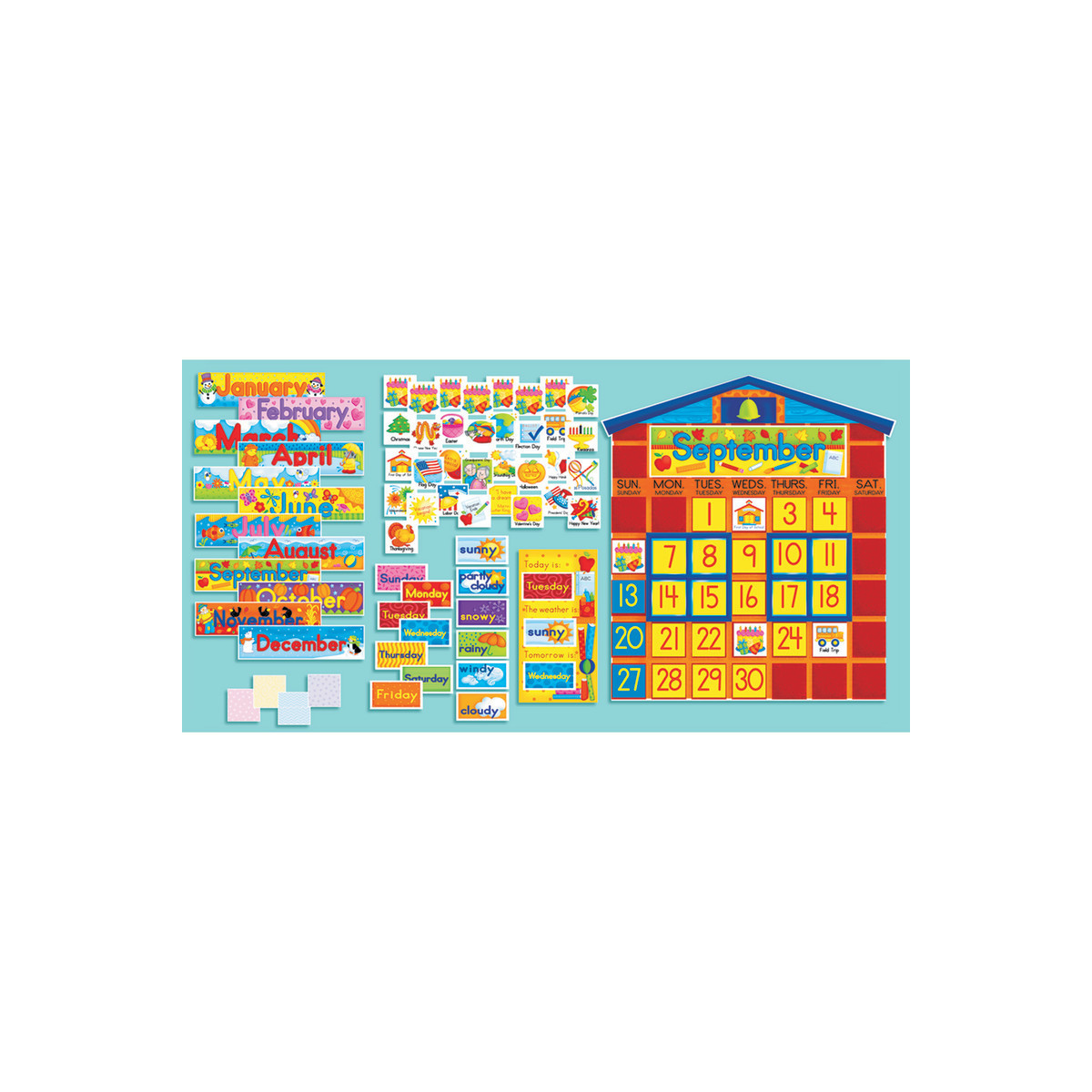 Each All-In-One Schoolhouse Calendar Bulletin Board Set includes 126 pieces: 23" tall schoolhouse calendar, 12 month cards, 7 day cards, 1-31 day cards (2 sets), special days, birthdays, weather, blank cards, 1 "Today Is" card, and a 4-page teaching guide. Sold as a pack of 2 complete bulletin board sets.