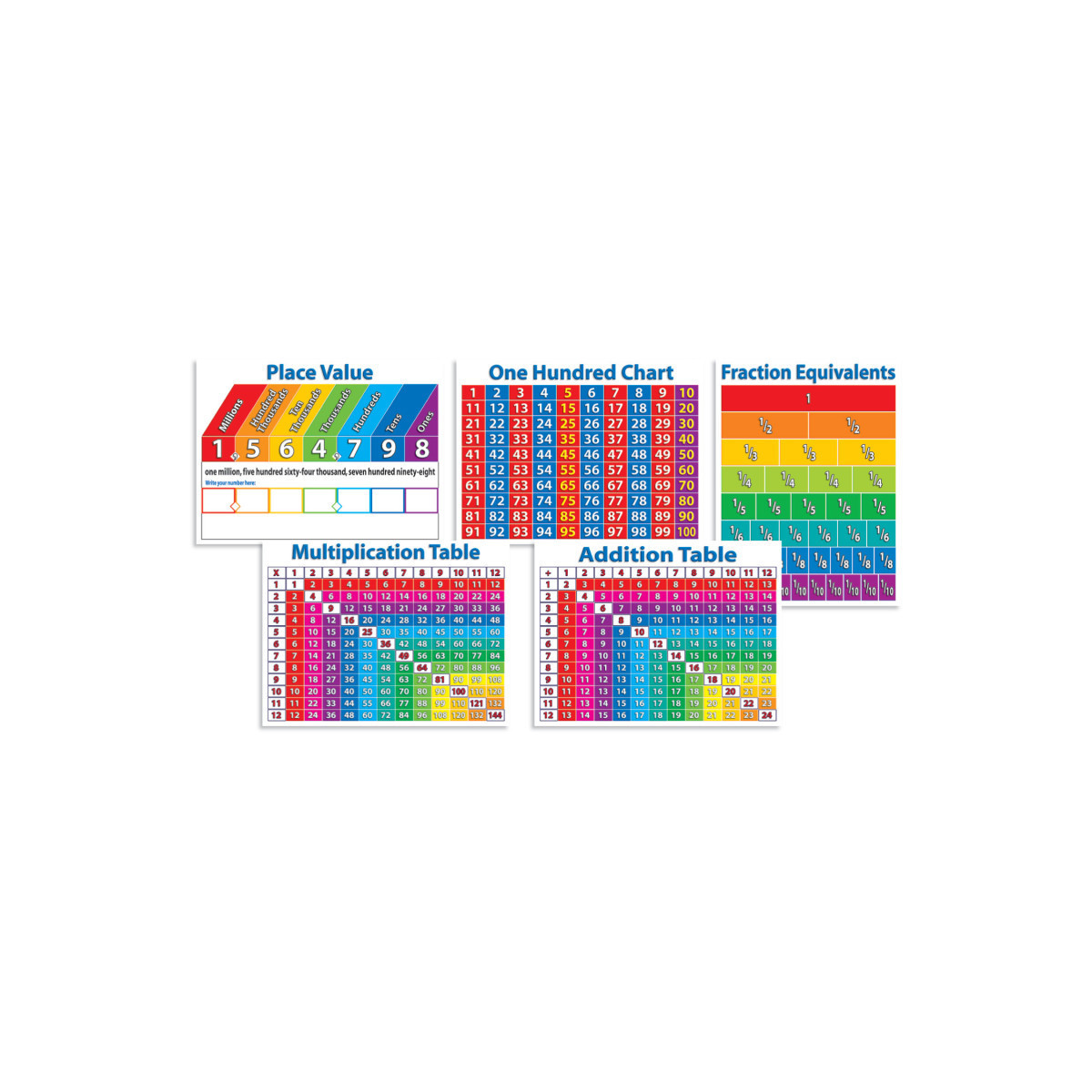 This all-in-one math reference set includes a place value chart, a hundred chart, an addition table, a multiplication table, and a fraction equivalents chart—a perfect supplement to any math curriculum! Includes an activity guide. Charts measure 18" x 24". Each set includes 5 pieces: place value chart, one hundred chart, addition table, multiplication table, and fractions chart.