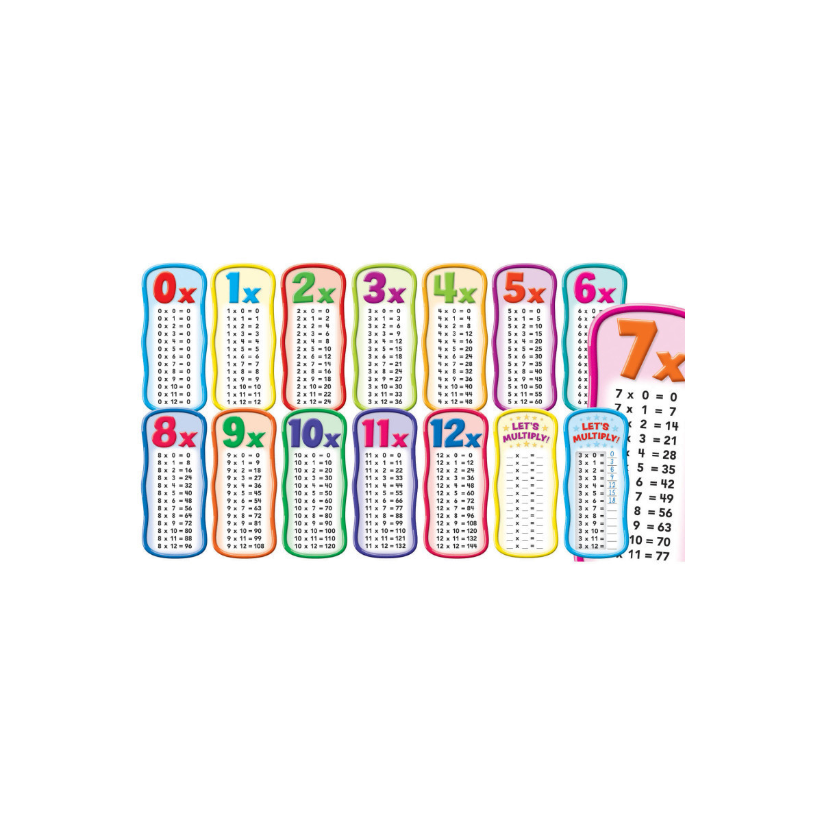 Help students master multiplication with these big, bright 0-12 times tables. Customize multiplication testing with a blank write-on/wipe-off times table and an answer cover-up. Includes: 0-12 times tables (8" x 18"), blank times table, answer cover-up, and activity guide.