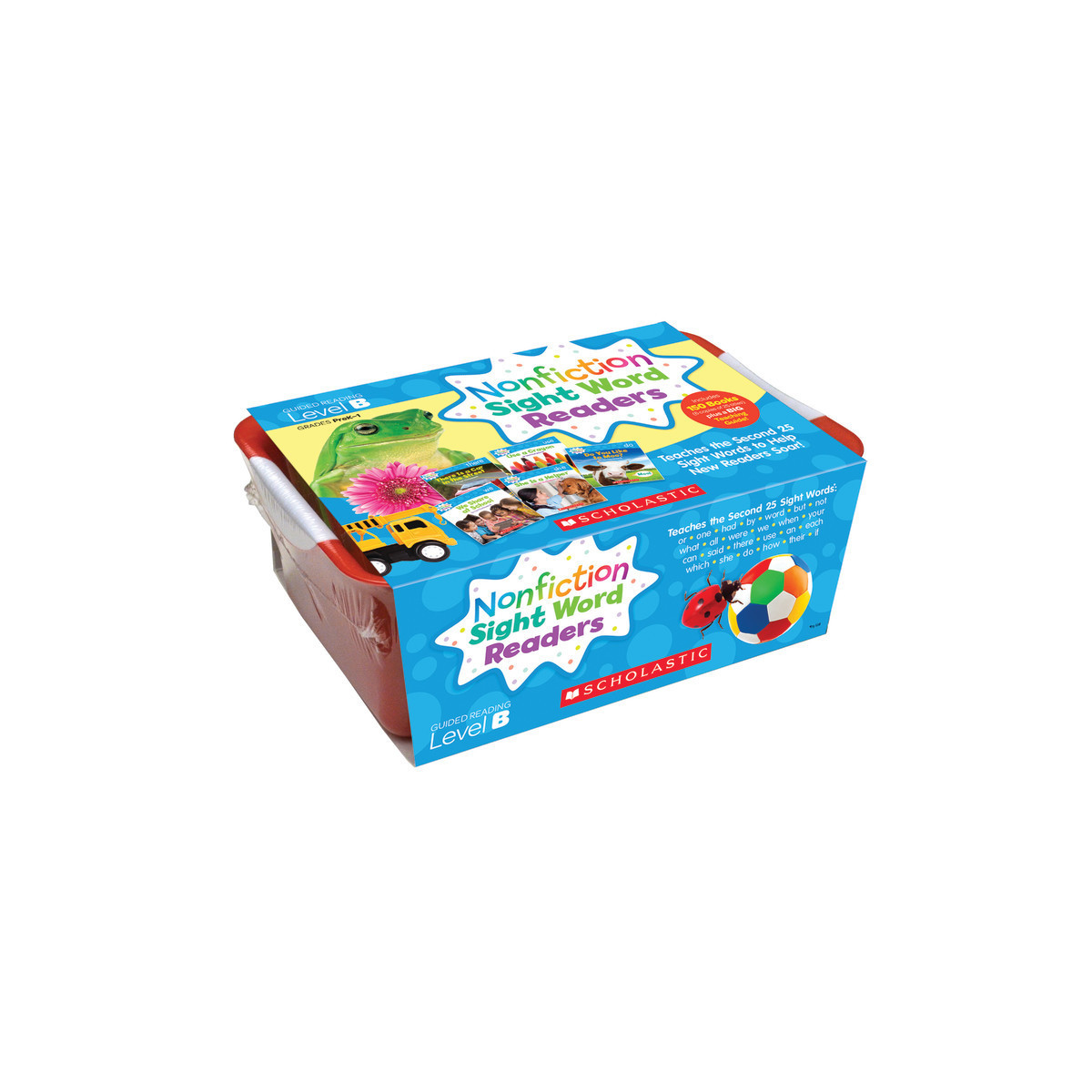 Set the stage for new readers to soar with these just-right books that teach the second 25 sight words! This sturdy tub includes 6 copies of 25 titles, each focused on a key sight word from the Fry List: or, one, had, by, word, etc. The books' real-world topics with predicable text are super-engaging to make mastering these must-know words easy and fun. Includes a big teaching guide filled with strategies and reproducibles to reinforce sight-word knowledge. And here's more great news: The books, correlated with Guided Reading Level B, are perfect for group learning!