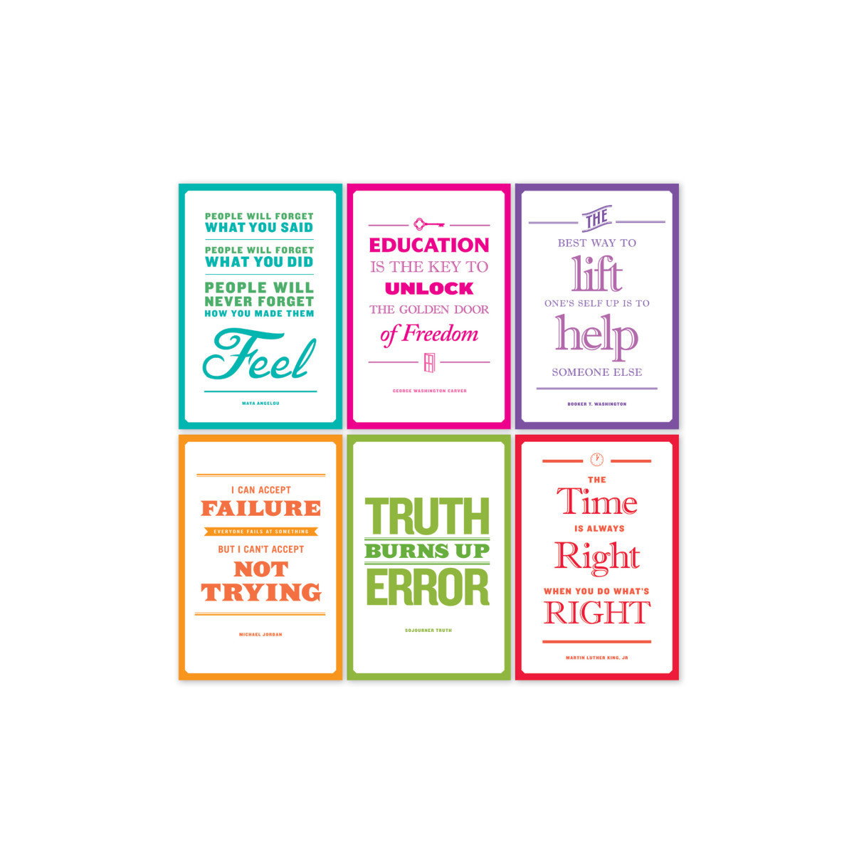Inspire students with this 6-poster set featuring notable quotes from Maya Angelou, George Washington Carver, Michael Jordan, Martin Luther King, Jr., Sojourner Truth, and Booker T. Washington. Perfect for Black History Month (and all year round). Includes six, 12" x 18" posters.