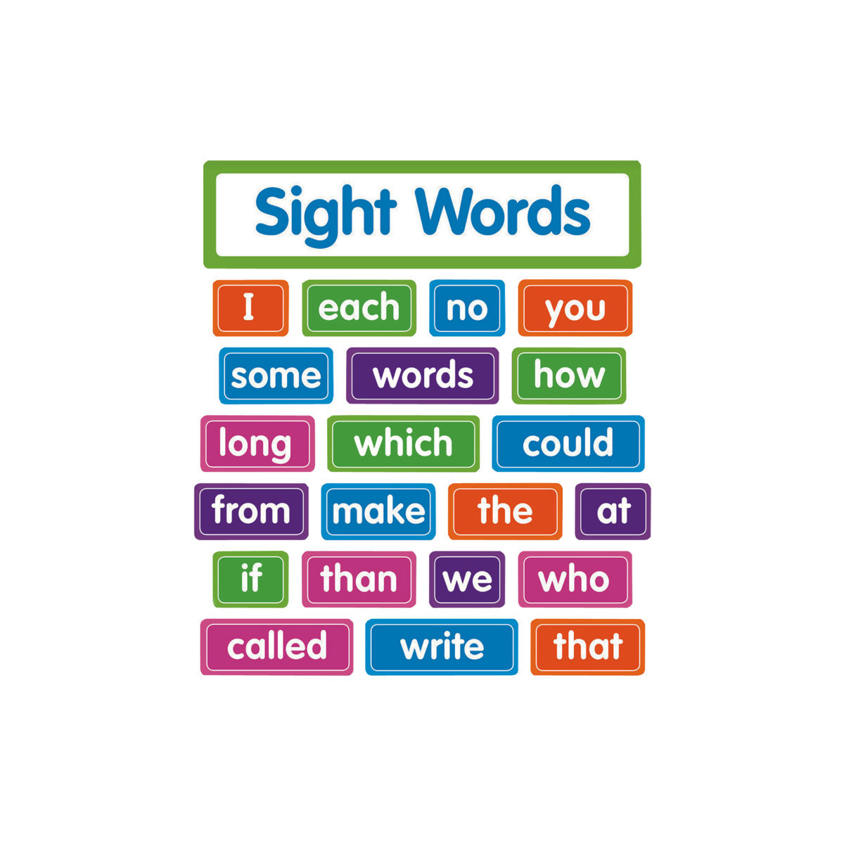 Reinforce sight word learning with this colorful word wall set. Features the first 100 words from the Fry list. A perfect addition to the early learning classroom.