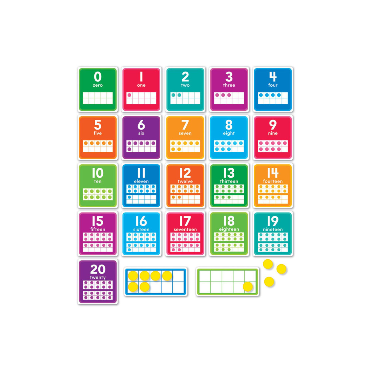 Help children learn numbers 0-20 with this colorful bulletin board set. Each number is presented as a numeral, in word form, and on a 10 frame. Includes two blank 10 frames and 20 counters for hands-on practice.