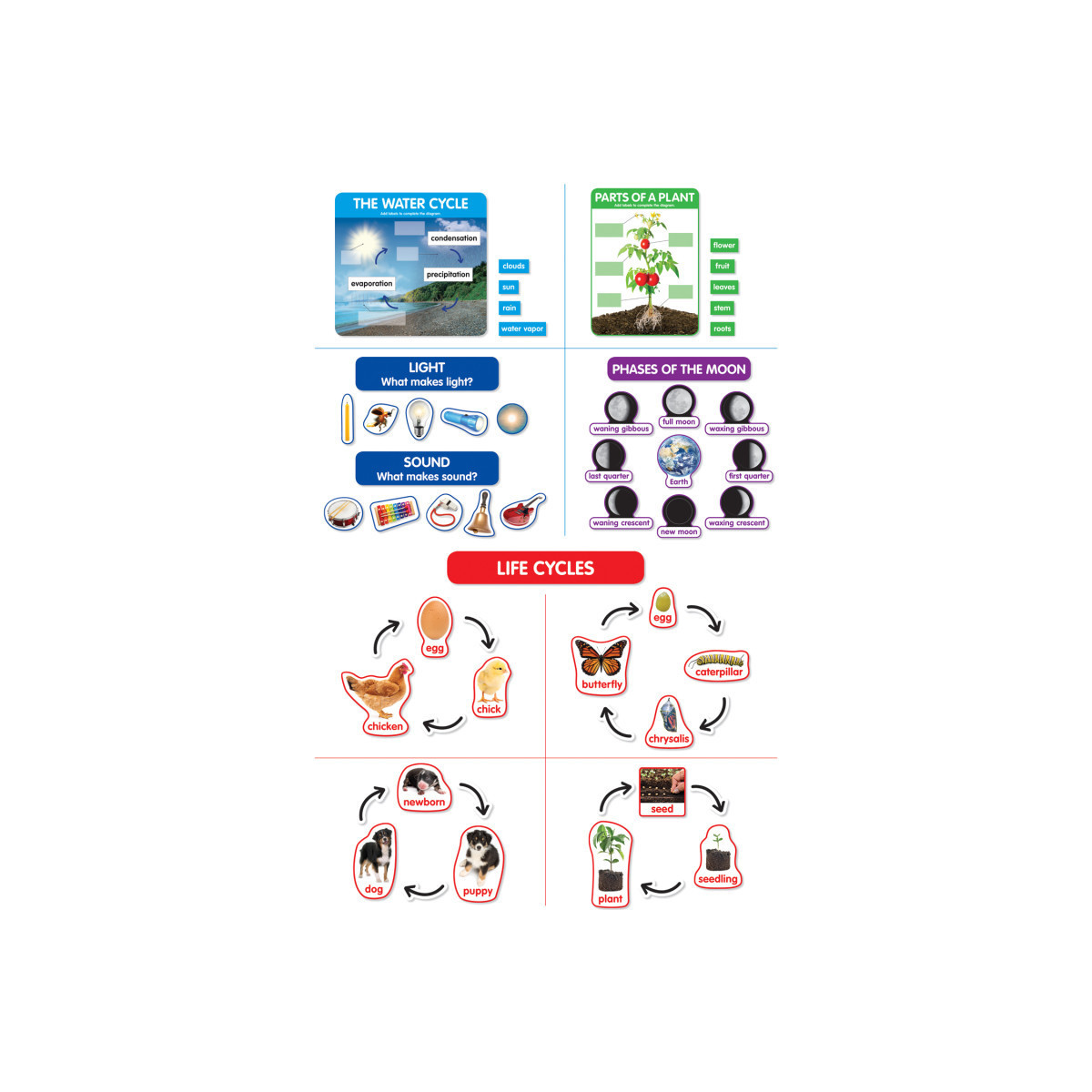 • Topics: Life Cycles (chicken, butterfly, dog, plant); Parts of a Plant; The Water Cycle; Phases of the Moon; Light & Sound