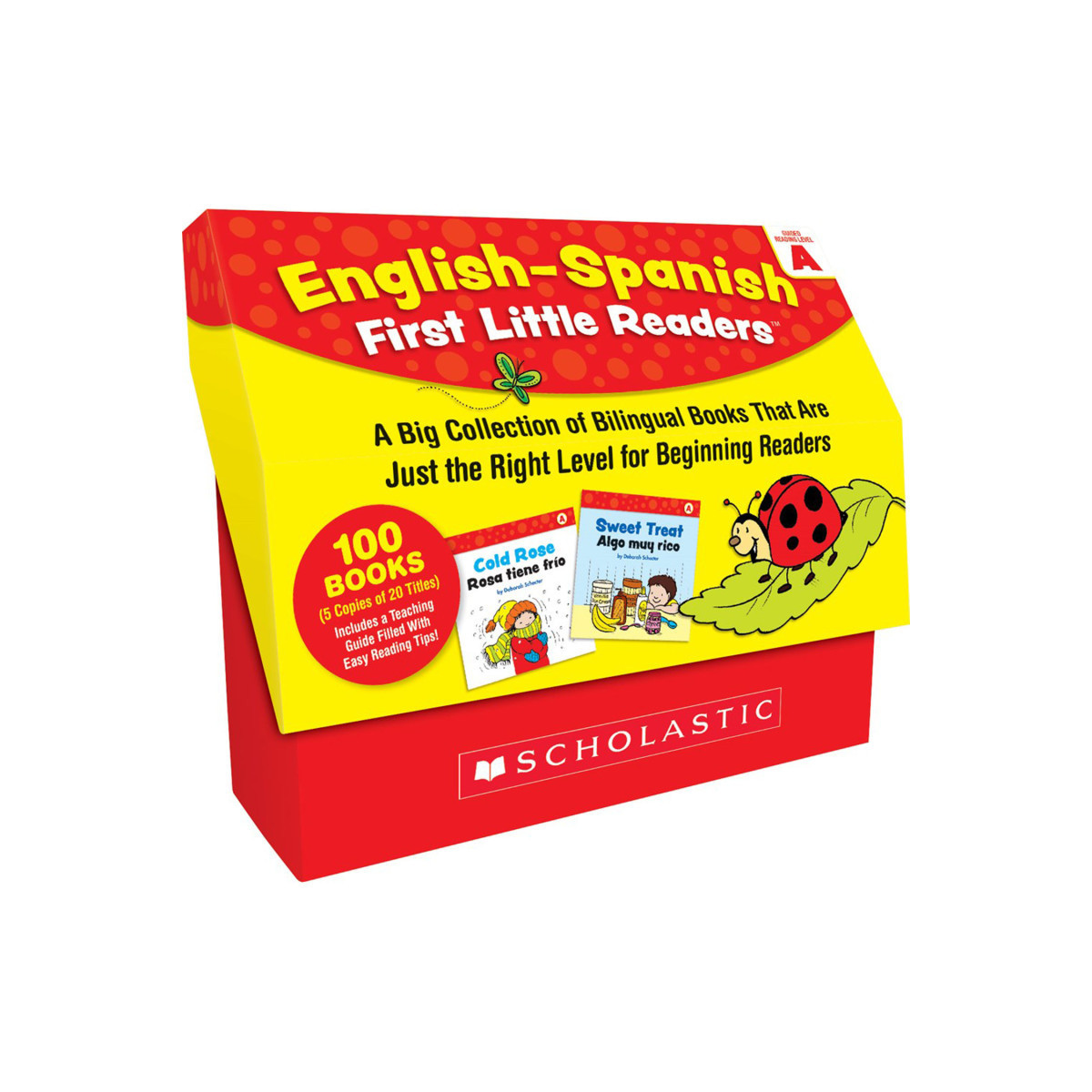 Give English Language Learners the support they need in reading with these irresistible little books featuring text in English and Spanish. Written to correlate with Guided Reading Level A, these simple, predictable stories feature high-frequency words, rhyming, repetition, and helpful illustrations on topics students love. Perfect as a bilingual resource for early learners or for introducing English speakers to a new language. Includes 100 full-color, 8-page books (5 copies of 20 titles), 32-page teaching guide and a sturdy storage unit.