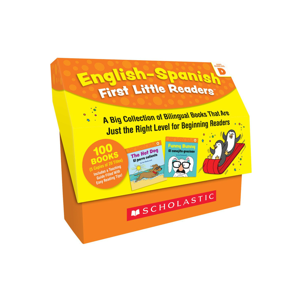 Give English Language Learners the support they need in reading with these irresistible little books featuring text in English and Spanish. Written to correlate with Guided Reading Level D, these simple, predictable stories feature high-frequency words, rhyming, repetition, and helpful illustrations on topics students love. Perfect as a bilingual resource for early learners or for introducing English speakers to a new language. Includes 100 full-color, 8-page books (5 copies of 20 titles), 32-page teaching guide and a sturdy storage unit.