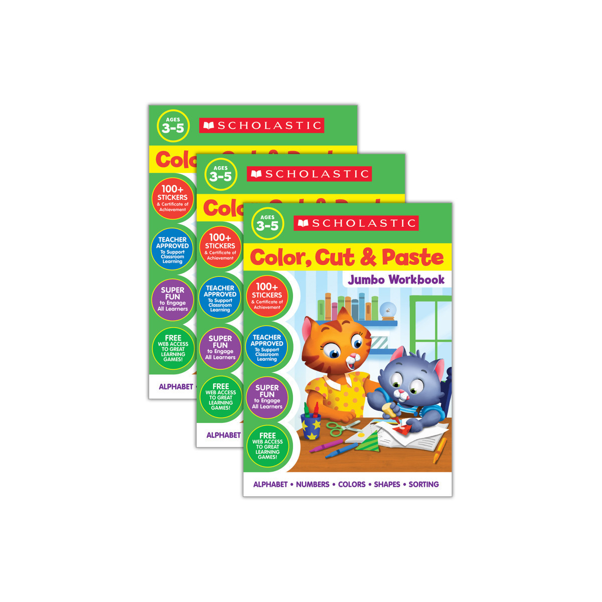 Building fine-motor skills is a blast with this big collection of coloring, cutting, and pasting pages! These kinesthetic activities reinforce alphabet awareness, numbers, colors, shapes, sorting, and more! Includes easy craft projects and motivating stickers. A super way to get little learners all set for school! Sold as a pack of 3 workbooks.