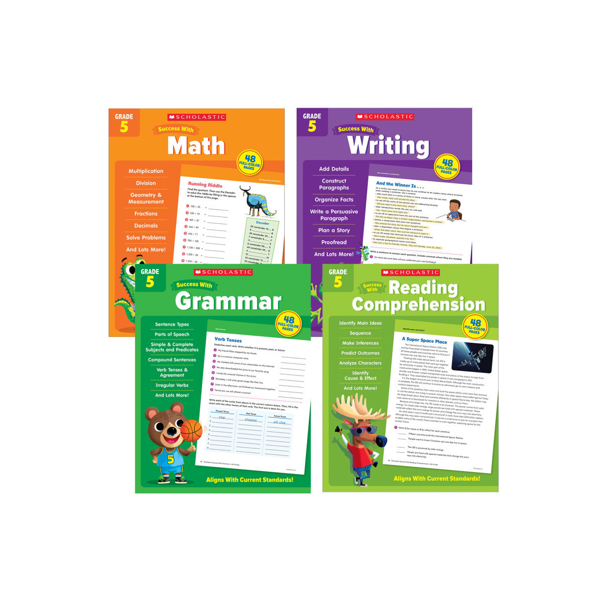 Give students the targeted, skill-building practice they need with these best-selling books! Each book has more than 40 ready-to-use and easy-to-follow engaging activities designed to help teach and reinforce essential skills. The 41 exciting books in this series provide invaluable practice kids need to master key learning skills! This bundle includes four fifth grade workbooks: Success With Grammar, Success With Math, Success With Reading Comprehension, and Success with Writing.