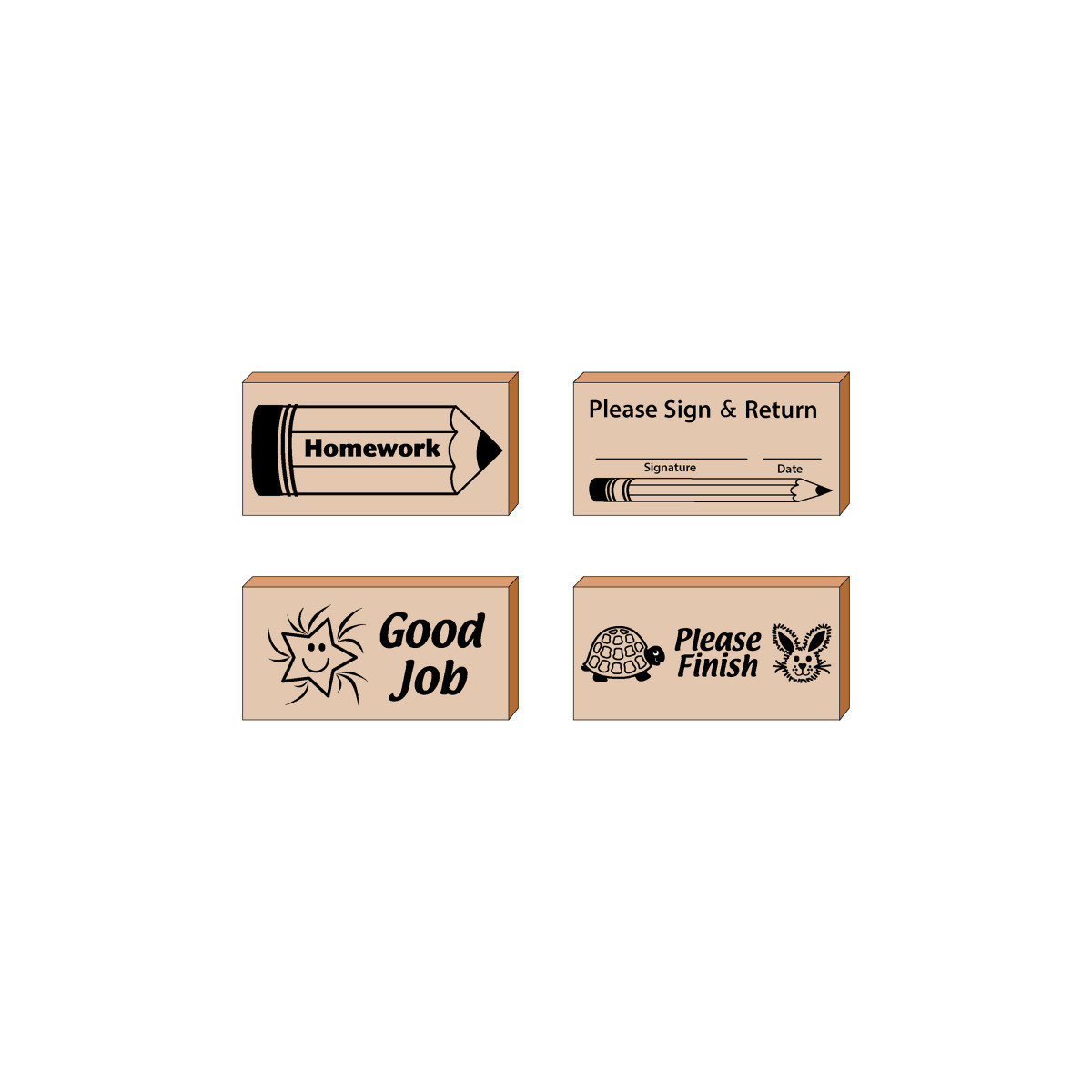 Our Teacher Stamps are ideal for encouraging good work habits and providing positive reinforcement. With a variety of stamps reflecting standard grading comments, positive messages, and offering constructive criticism, there is a teacher stamp for any situation. It's grading made easy, simply use one of the teacher stamps and stamp on the page. Better yet, students will appreciate the feedback and seeing that their work is being acknowledged. They are also a great way to involve parents by encouraging parental involvement. Great for use in the classroom or homeschool, these stamps are the perfect tool for any teacher. Teacher Stamps are also a unique idea for a teacher gift that they can use again and again. At 1.25" x 2.5", these stamps are an ideal size for easy storage and they fit in your hand comfortably. A rubber stamp with a wooden block, these stamps are made in the USA. Does not come with ink. Each set includes 4 stamps.