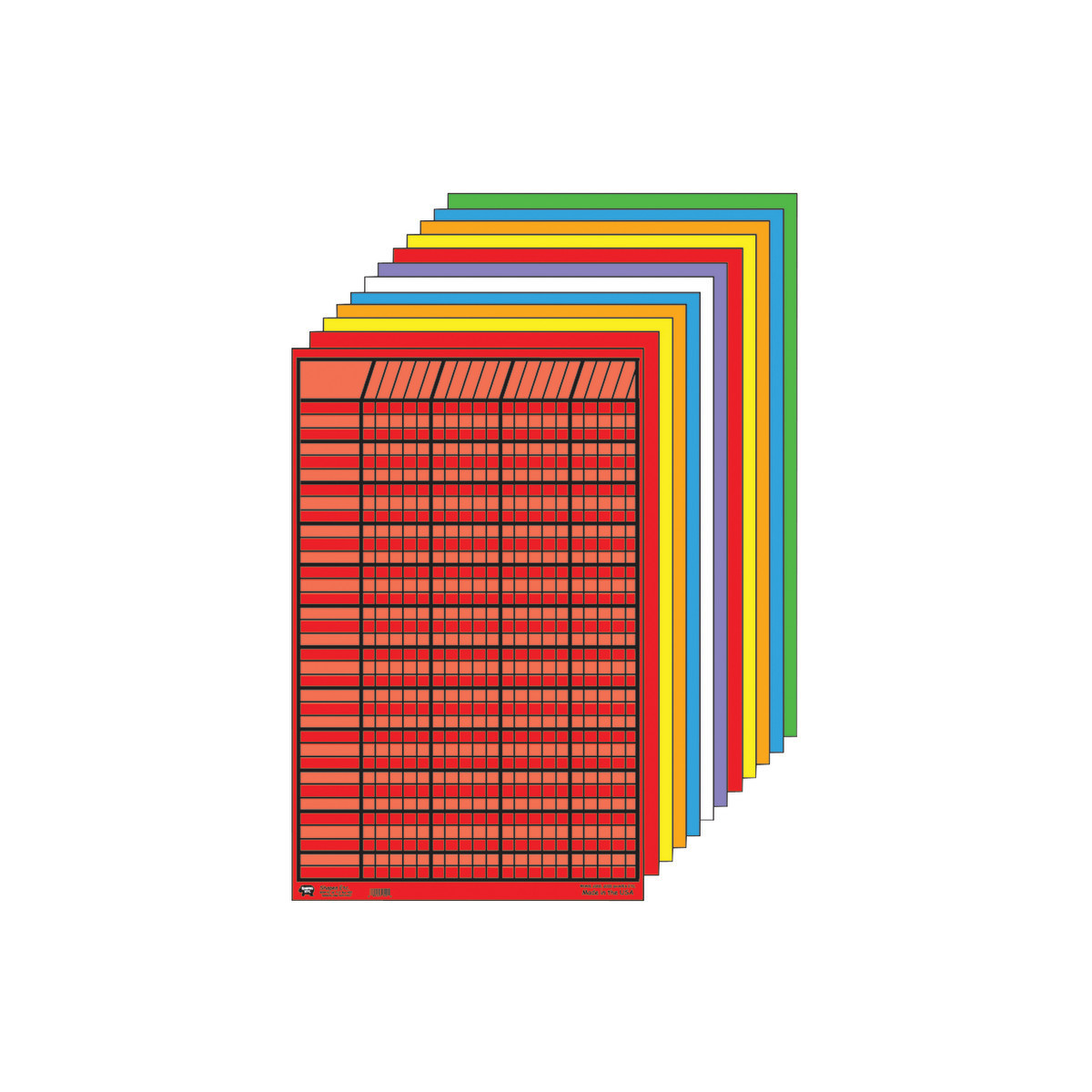 Incentive charts measures 14" x 22" and has 20 rows across and 35 rows down. The squares measure 1/2" x 1/2". Printed on heavy tagboard with soy-based ink. Each set includes an assortment of 12 colors, pre-sorted in a plastic bag.