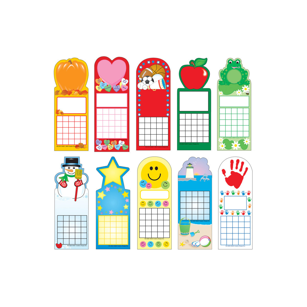 Our Personal Incentive Charts Seasonal Pack is perfect for keeping track of incentives and rewards the whole year through. Ideal for positive reinforcement, each chart has 25 squares, plenty of spaces for achievable goals and using with stickers, stamps, pens and more. A blank spot on the front of the chart can be personalized with the child's name or task to be completed, and the blank back is perfect for writing the reward being earned, writing words of encouragement or keeping track of books read. These charts are a great way to motivate students and allows them to monitor their own progress, as well as encouraging good behavior and teaching kids' responsibility. They work well for attendance charts, reading charts, recording homework and assignments completed, monitoring good behavior and much more. In this pack you receive an assortment of 10 seasonal styles, one for every month of the school year (designs may vary depending on availability). You receive 24 charts per style for a total of 240 charts and each chart is approximately 2.75" x 7.5" in size.