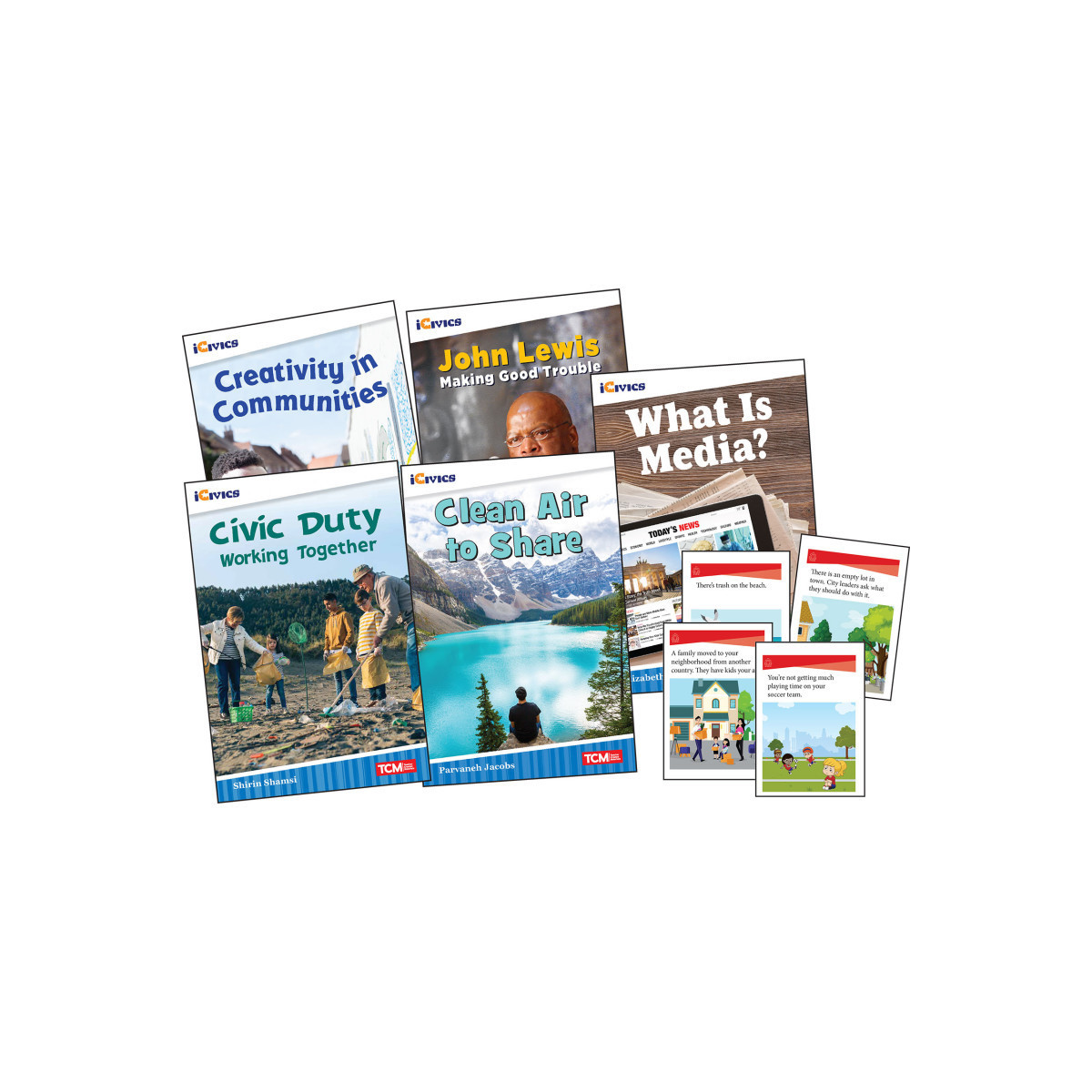 Introduce age-appropriate civics topics focusing on community and social awareness with this great third-grade reading set. Learn how creativity can help communities, discover why clean air is important, and examine media sources to determine reliability. This iCivics reading set introduces age-appropriate topics in meaningful and easy-to-understand ways. Each nonfiction book includes a fictional story to help readers understand and relate to the topic. To enhance the reading experience and build critical-thinking skills, each book features Read and Respond questions, Think and Talk callouts, and a Civics in Action activity to motivate readers to make a difference. This 5-book set also includes a deck of game cards with instructions for 3 different games to reinforce literacy and civics skills. This set includes: What Would You Do? Game Cards; Creativity in Communities; John Lewis: Making Good Trouble; Civic Duty; Working Together; Clean Air to Share; and What Is Media?