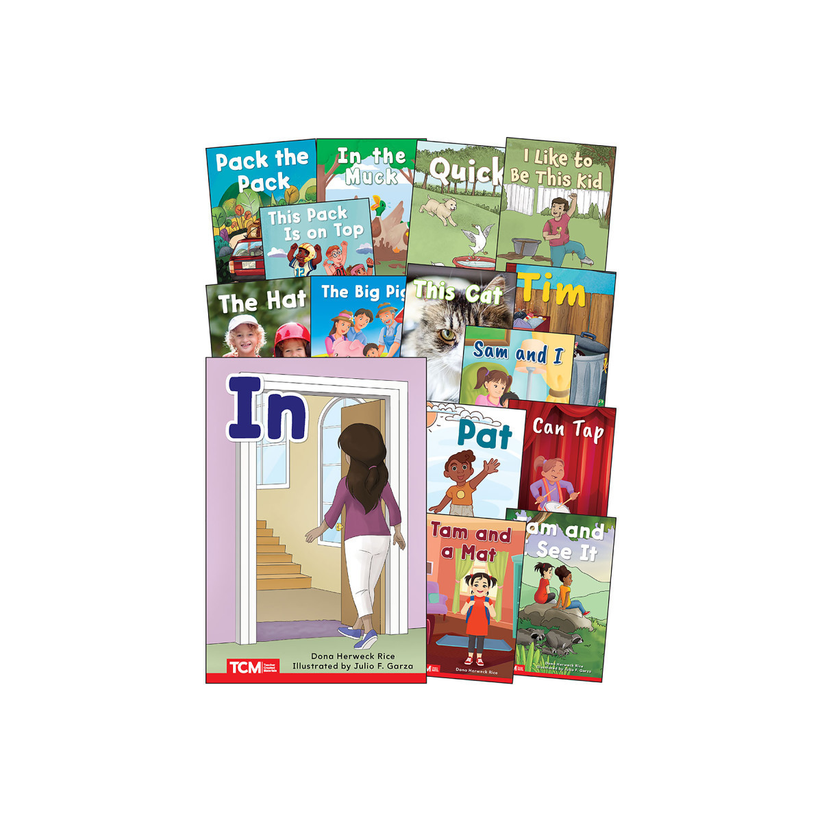 This fun and memorable Prekindergarten/Kindergarten set includes sequenced decodable books, #1–#15. The books introduce early readers to new sounds and progressively develop phonological awareness, phonics knowledge, and high-frequency word recognition. Five books in this set are text-first books, offering decoding practice without illustrated clues first, then the text is repeated on the next spread with pictures. Each book includes a helpful family engagement page plus the phonics focus and high-frequency words learned. This set aligns with the Science of Reading and Structured Literacy. This 15-book set includes: In, Tam and a Mat, Tam and I See It, Pat, I Can Tap, Sam and I, Tim, This Cat, The Big Pig, The Hat, This Pack Is on Top, Pack the Pack, In the Muck, Quick, and I Like to Be This Kid.
