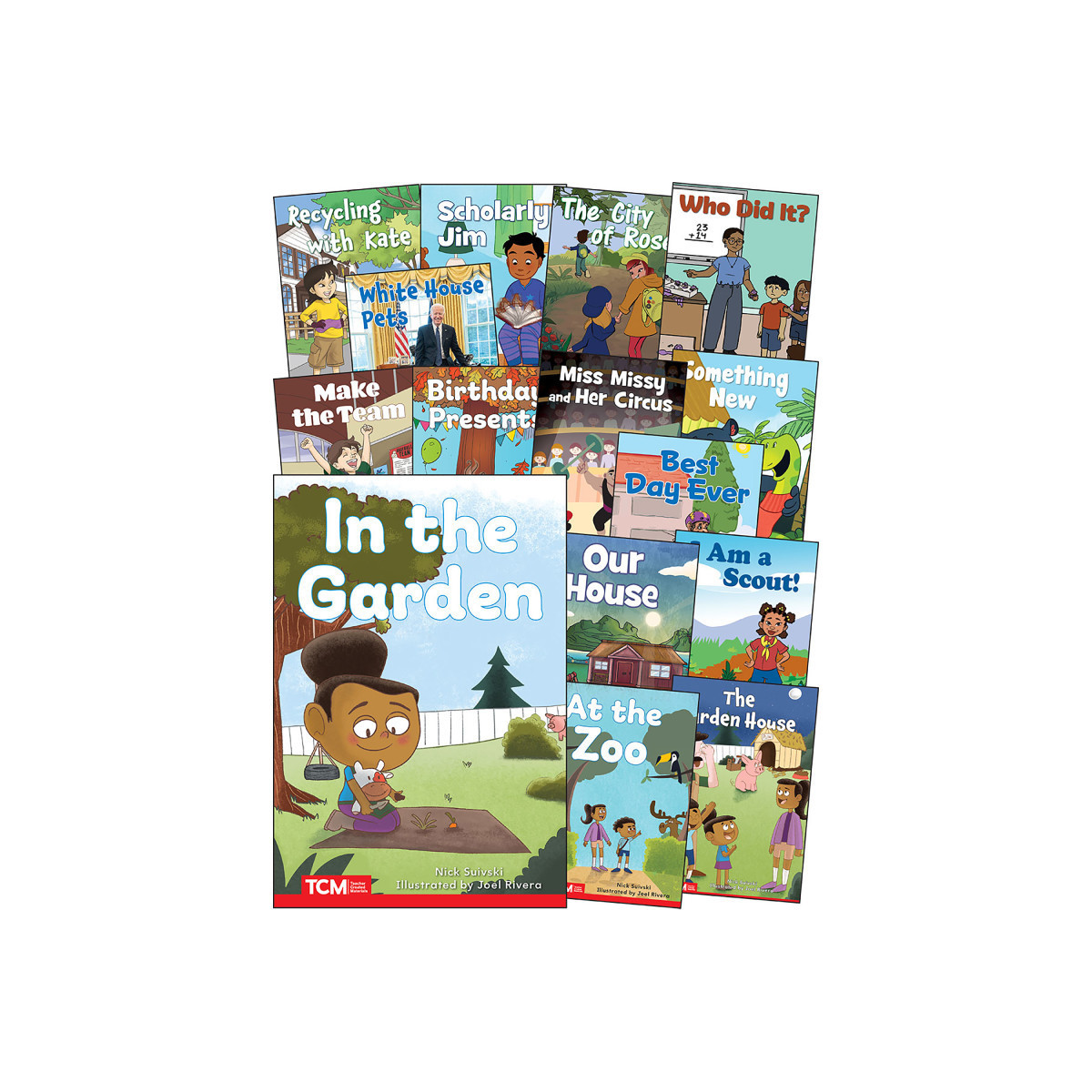 This fun and memorable second-grade set includes sequenced decodable books, #16–#30. The books introduce early readers to new sounds and progressively develop phonological awareness, phonics knowledge, and high-frequency word recognition. Six books in this set are text-first books, offering decoding practice without illustrated clues first, then the text is repeated on the next spread with pictures. Each book includes a helpful family engagement page plus the phonics focus and high-frequency words learned. This set aligns with the Science of Reading and Structured Literacy. This 15-book set includes: In the Garden, At the Zoo, The Garden House, Our House, I Am a Scout!, Best Day Ever, Make the Team, Birthday Presents, Miss Missy and Her Circus, Something New, White House Pets, Recycling with Kate, Scholarly Jim, The City of Roses, and Who Did It?.