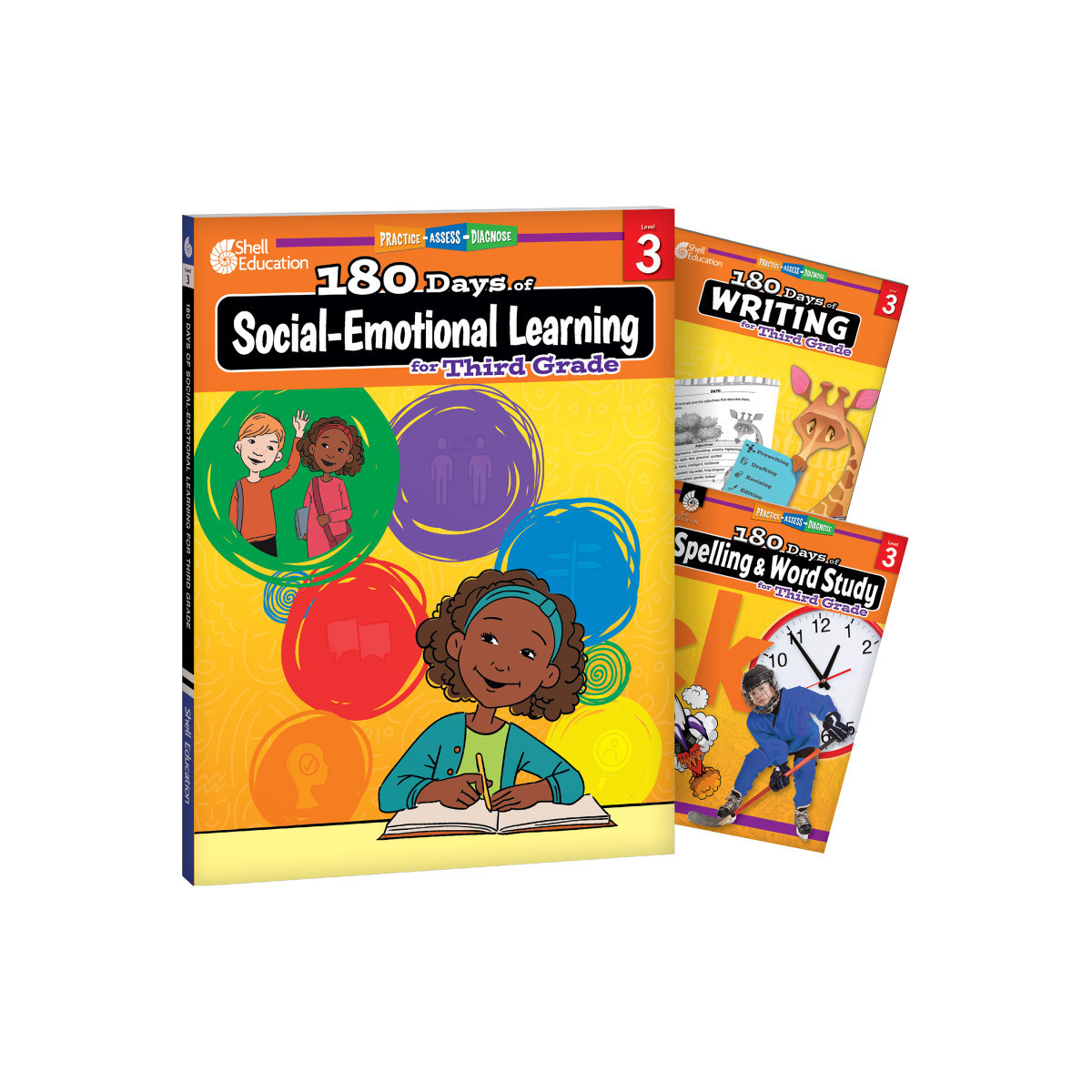 Shell Education 180 Days Social-Emotional Learning, Writing, & Spelling Grade 3: 3-Book Set