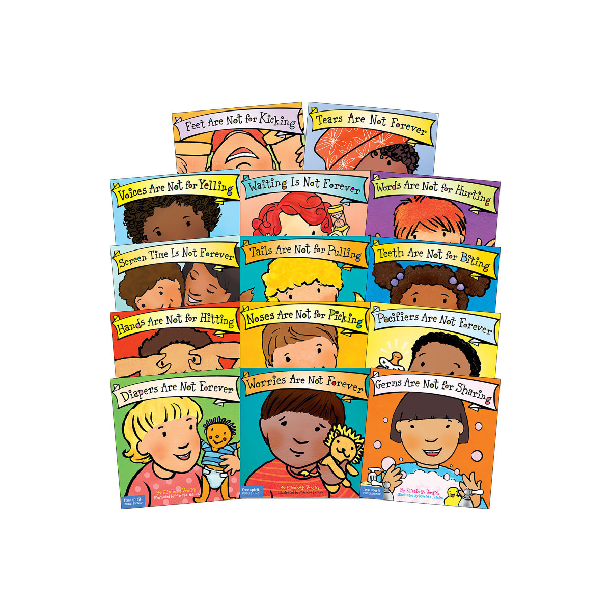 Simple words and delightful full-color illustrations guide children to choose peaceful, positive behaviors. Each book in the series, for ages one to four, includes a special section for parents and caregivers with ideas for discussion and activities. This 14-book set includes: Diapers Are Not Forever Feet Are Not for Kicking Germs Are Not for Sharing Hands Are Not for Hitting Teeth Are Not for Biting Voices Are Not for Yelling Waiting Is Not Forever Words Are Not for Hurting Worries Are Not Forever Noses Are Not for Picking Pacifiers Are Not Forever Screen Time Is Not Forever Tails Are Not for Pulling Tears Are Not Forever