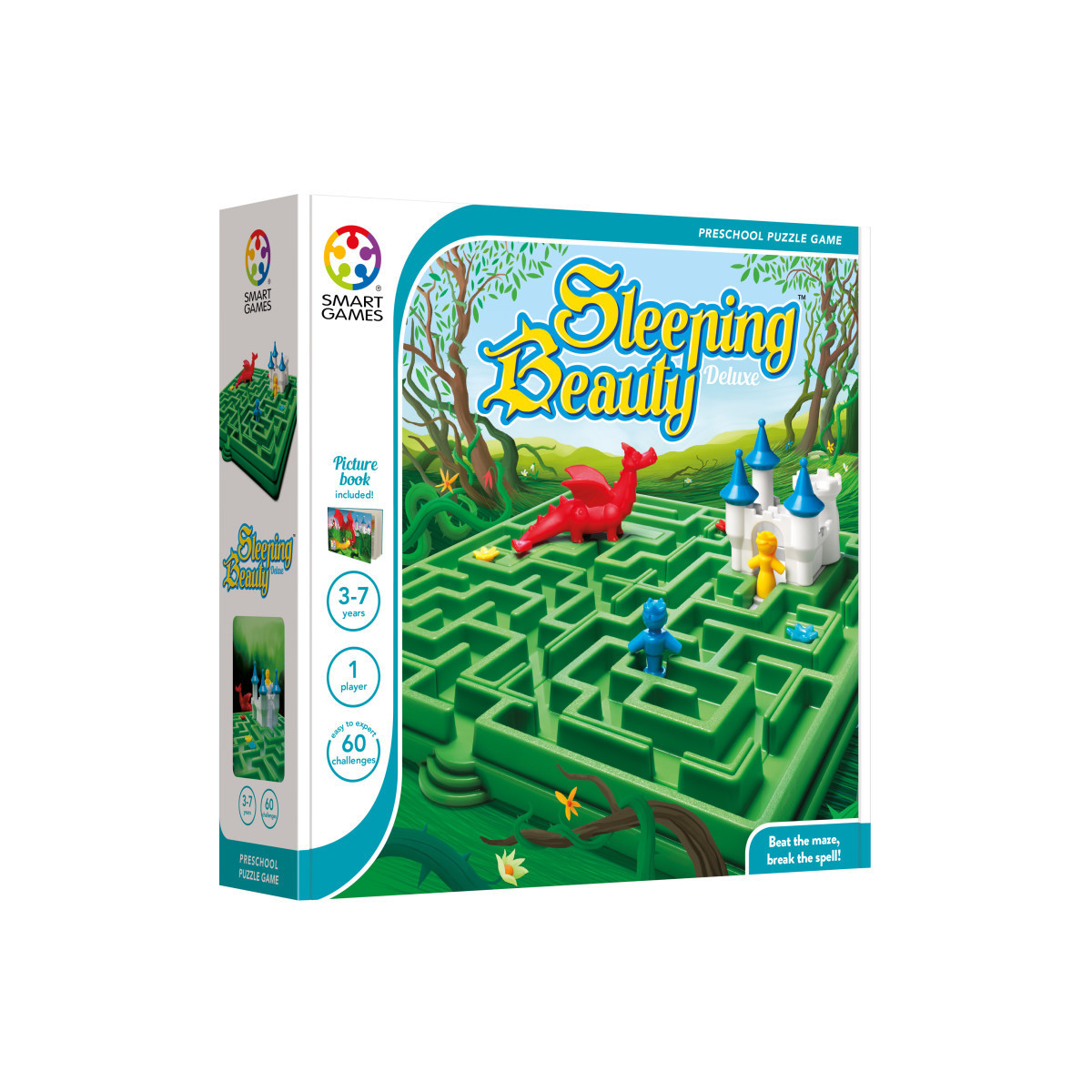 Once upon a time...Discover the magic of the classic fairy tale with this original puzzle game. Can you help the knight reach Sleeping Beauty's castle? Or maybe you'd prefer to help Sleeping Beauty escape on her own? Try to find the path from the entrance of the maze to the castle...without getting lost! Or perhaps you prefer to play as the dragon? Then the object of the game becomes the opposite! Place the dragon in the maze so that he blocks all paths to the castle, preventing and the knight and Sleeping Beauty from reaching each other. Sleeping Beauty includes 48 challenges (24 with the dragon and 24 without). It also features a family friendly picture book with a modern twist on the original story. Contents: 4 Grids, Castle, Sleeping Beauty, prince, Dragon, Picture Book, and Challenge Booklet.