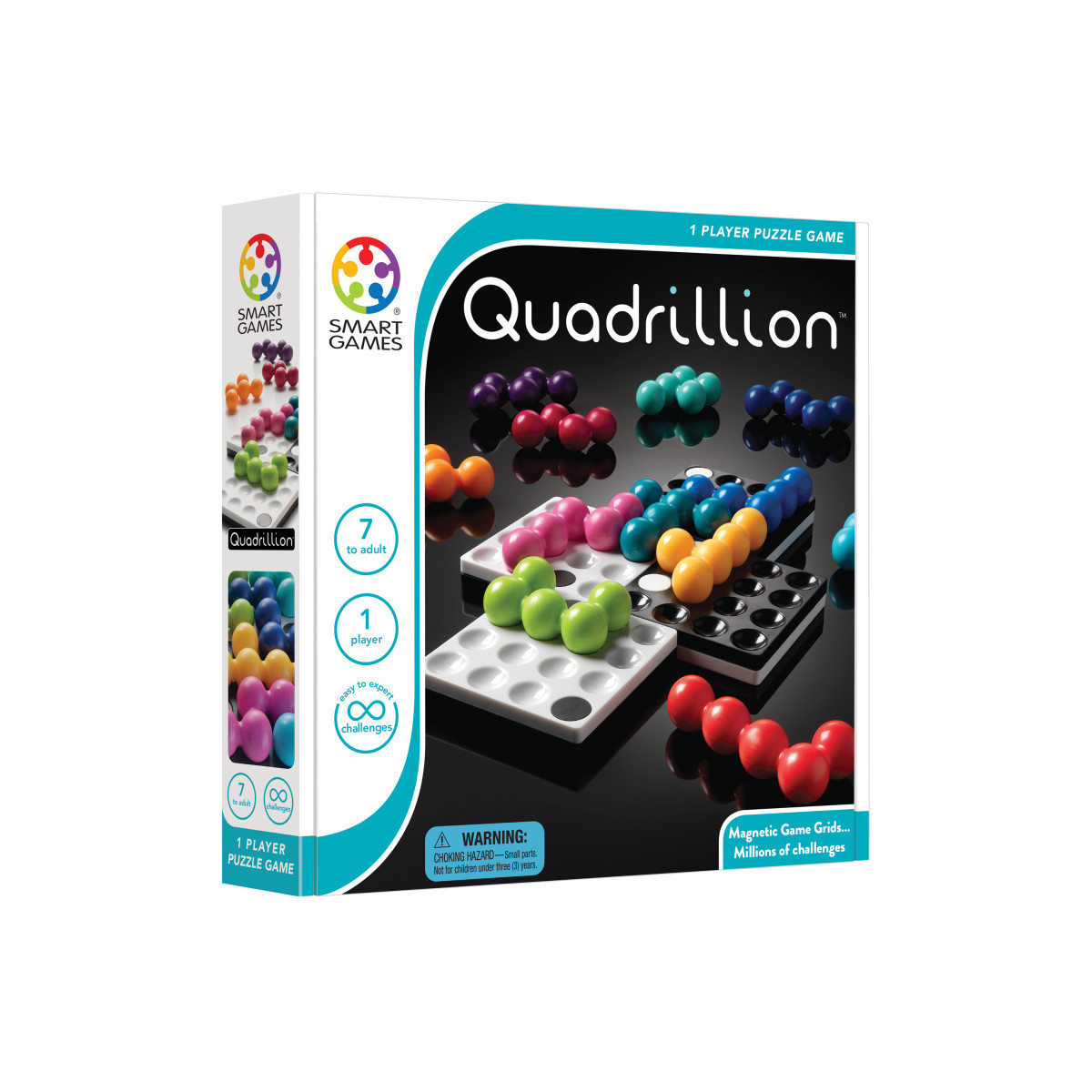 Click and Play! Quadrillion offers countless challenges and thousands of solutions...but can you find even one? Play Quadrillion by simply clicking the 4 magnetic grids together in any order to create your personal game board. The object of the game is to fit the 12 colored puzzle pieces on the game board you've just created. All possible board configurations can be solved, sometimes with thousands of variations, so you will never run out of challenges. The big, sturdy puzzle pieces are perfect for players of all ages. Starter booklet included... but not needed to play the game!