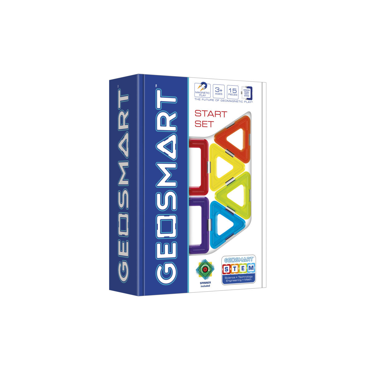 Use the squares and triangles to build your own solar creation and watch it spin! The GEOSMART Start Set includes 15 strong, bright geometric pieces, with a spinner to bring life to you kids' creations. GEOSMART is the future of geomagnetic play. An ideal STEM magnetic construction set, GEOSMART enables fun learning at home and in the classroom. Featuring bright colors, strong magnetic pieces and a patented double-safety system, GEOSMART offers unsurpassed safety and durability for endless creative play! The GEOSMART Solar Spinner set includes: 6 squares, 8 triangles and 1 spinner.