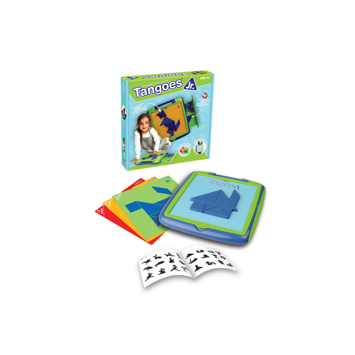 Tangoes Jr. brings the fun, creativity, and problem-solving challenges of Tangoes to a unique toy designed specifically for preschoolers. With a large magnetic play surface, 7 large magnetic puzzle pieces, and 12 double-sided puzzle cards offering 2 levels of play with recognizable images, children can create 11 classic tangram images. An additional blank card is included allowing kids to challenge their creativity and create their own images.