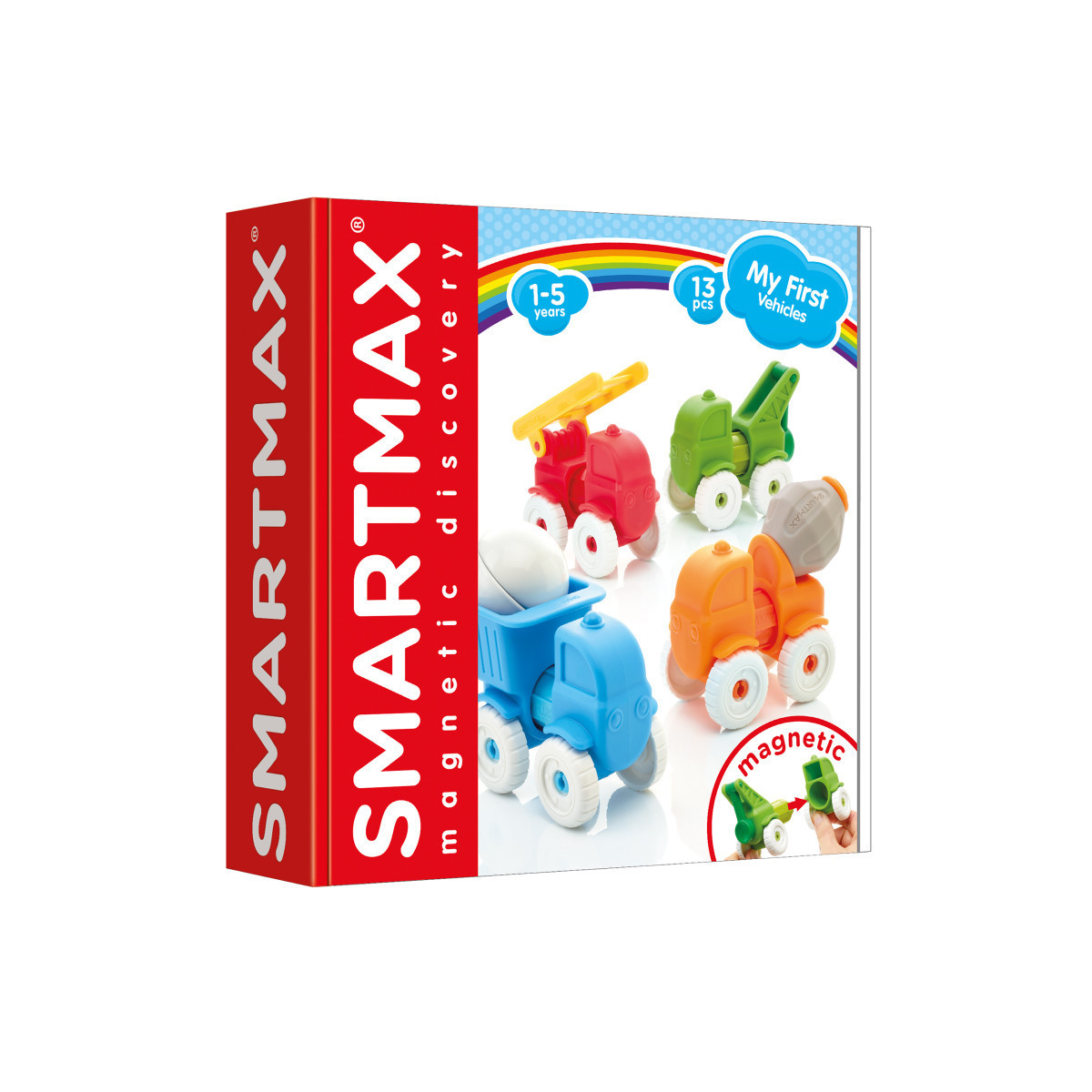 Young children (12+ months) can safely discover the magic of magnetism with the SMARTMAX® "My First" collection. My First Vehicles includes 13 pieces that are building blocks to create 4 different trucks. When clicked together the trucks move on their wheels, resulting in a true creative and sensory experience. The materials used are soft and friendly to little have, while the magnetic bars are strong and safe.