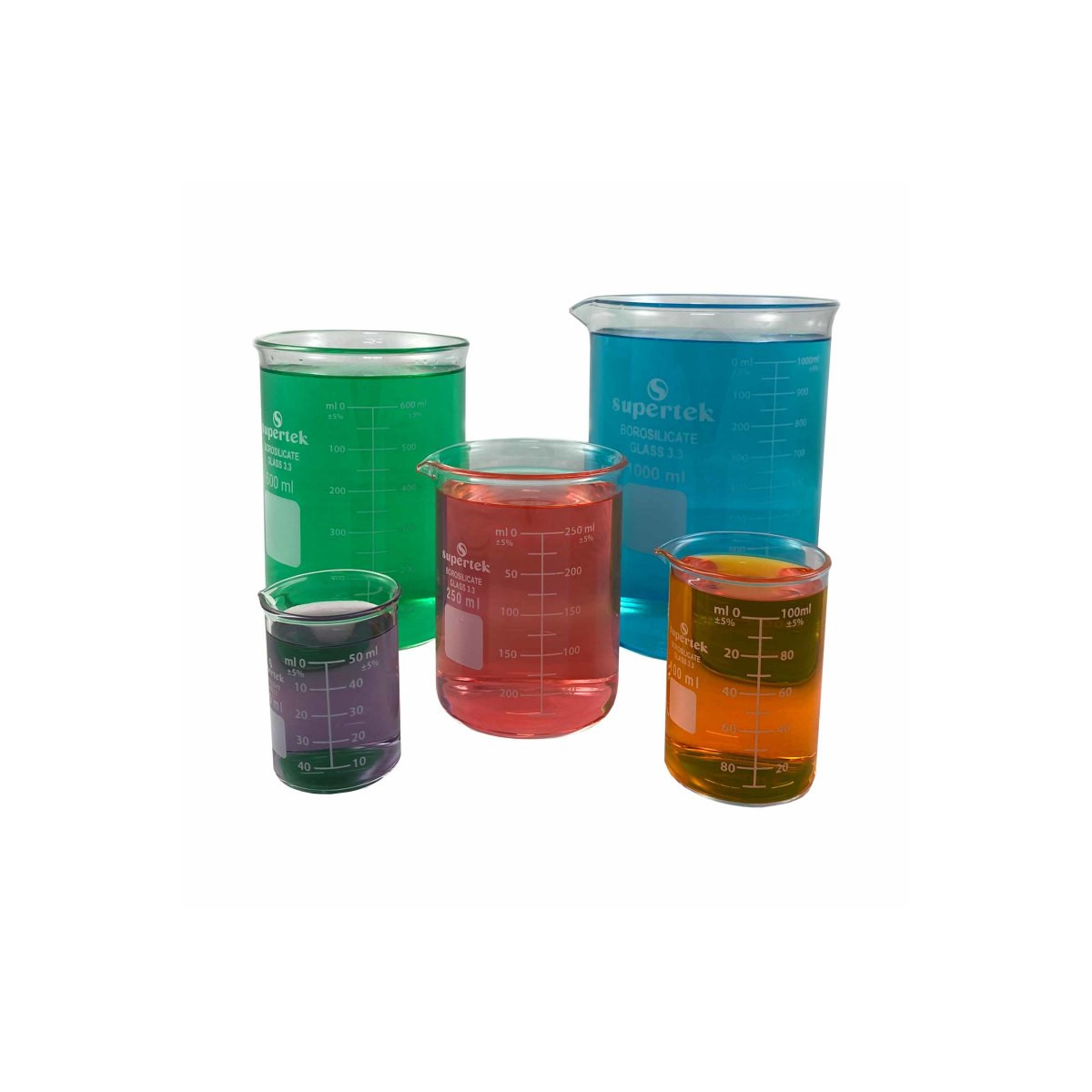 Includes 5 beakers in sizes 50ml, 100ml, 250ml, 600ml, and 1000ml