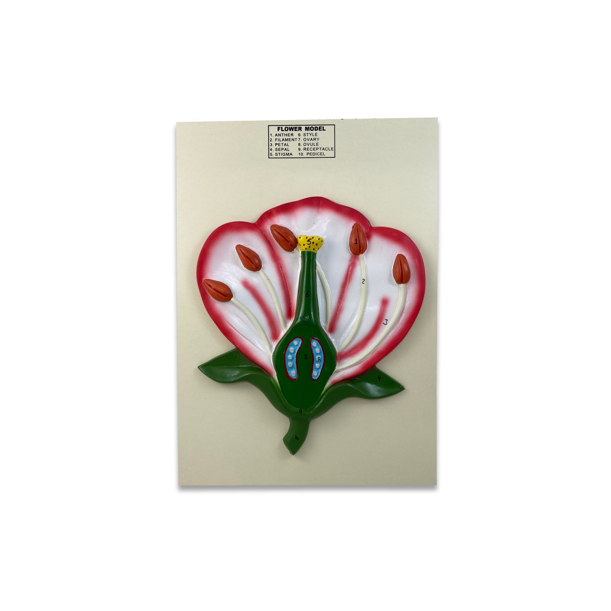 3-D Flower Model mounted on a wooden back. The model is an enlarged view of a typical flower with cut-a-way sections to show the major parts: Anther, Filament, Petal, Sepal, Stigma, Style, Ovary, Ovule, Receptacle, and Pedicel. Key Card included. Measures 14" x 10".