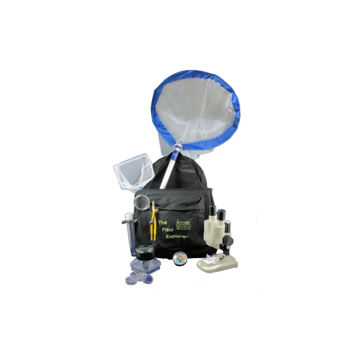 The Field Explorer is the perfect field trip companion! This kit features our 20X battery operated stereo microscope. Included in this backpack is our insect net, aqua net, bug viewer, hand held magnifier, collection tube (safety test tube), 35mmD petri dishes, forceps, pencil, and a journal to record all that you find.