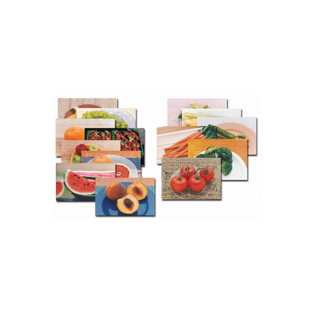 - Includes apple, banana, grapes, orange, watermelon, strawberries, peach, grapefruit, corn, tomato, broccoli, carrots, peas, and salad